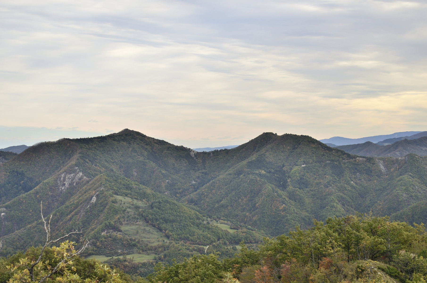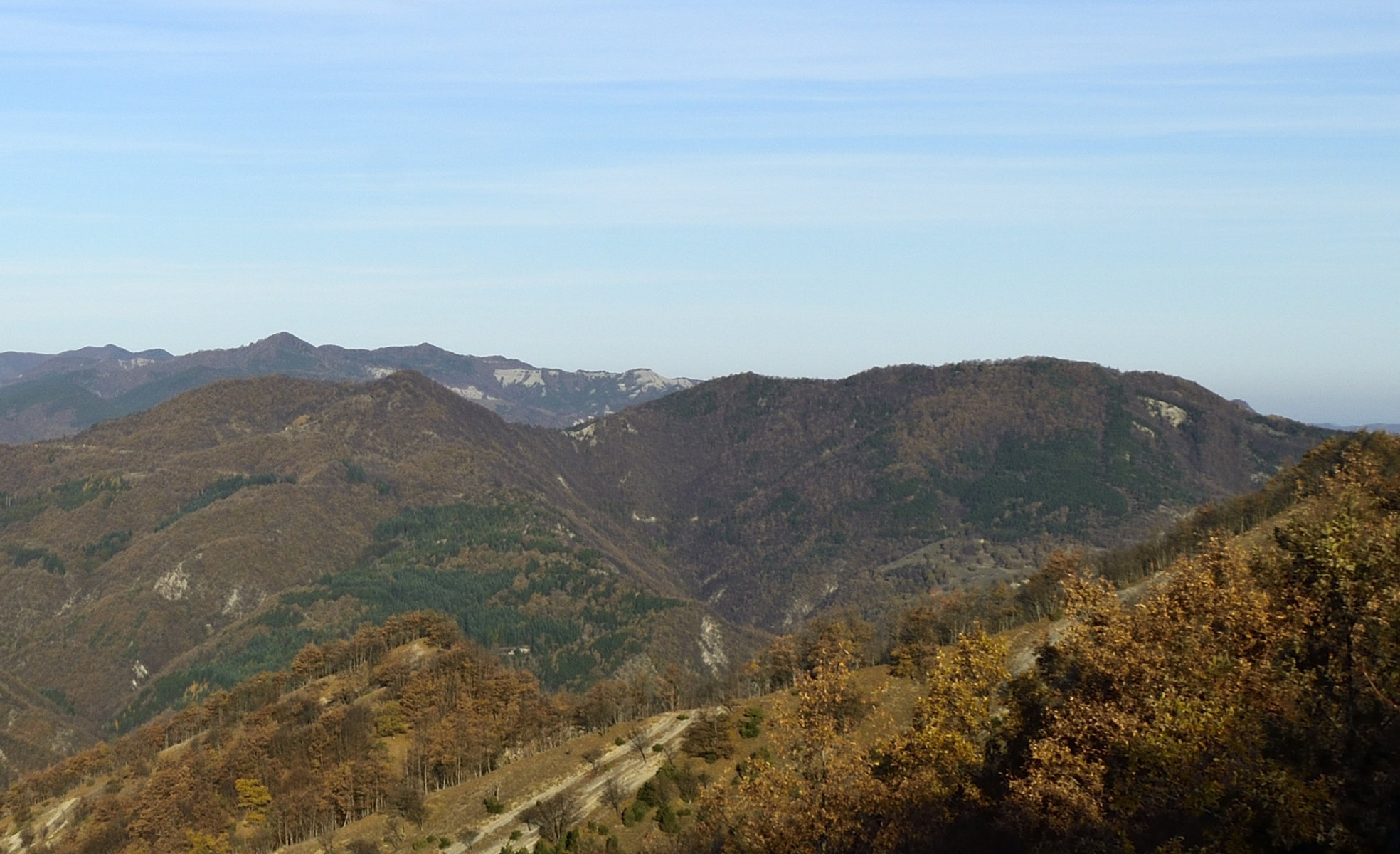 00d6 – 00d7 – Dal Canale del Pentolino, sulla Giogana presso Poggio Scali, panoramica settentrionale fino all’Adriatico con particolare della Valle del Corneta, attestata sul Monte La Rocca e il versante occidentale del massiccio del Monte Marino (10/11/14).