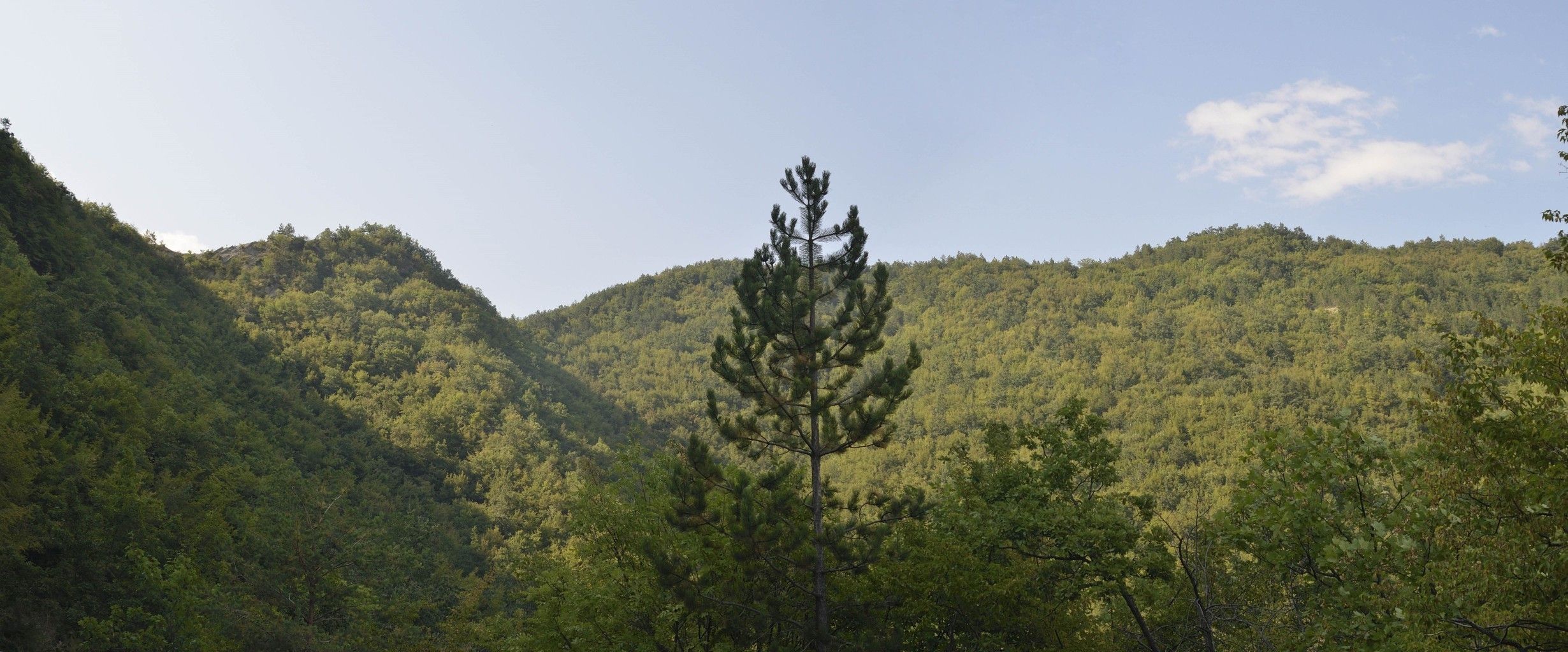 00a2 – 00a3 – Dal contrafforte principale, tra il Monte Piano e Macchia del Cacio, la valle del Fosso di Rio Salso guida lo sguardo ad attraversare la Valle del Bidente e risalire il versante di Strabatenza, di cui si nota la macchia restaurativa di pinacee, verso il contrafforte secondario dove emergono il Monte La Rocca e il complesso del Monte Marino (27/11/11 – 1/01/12).