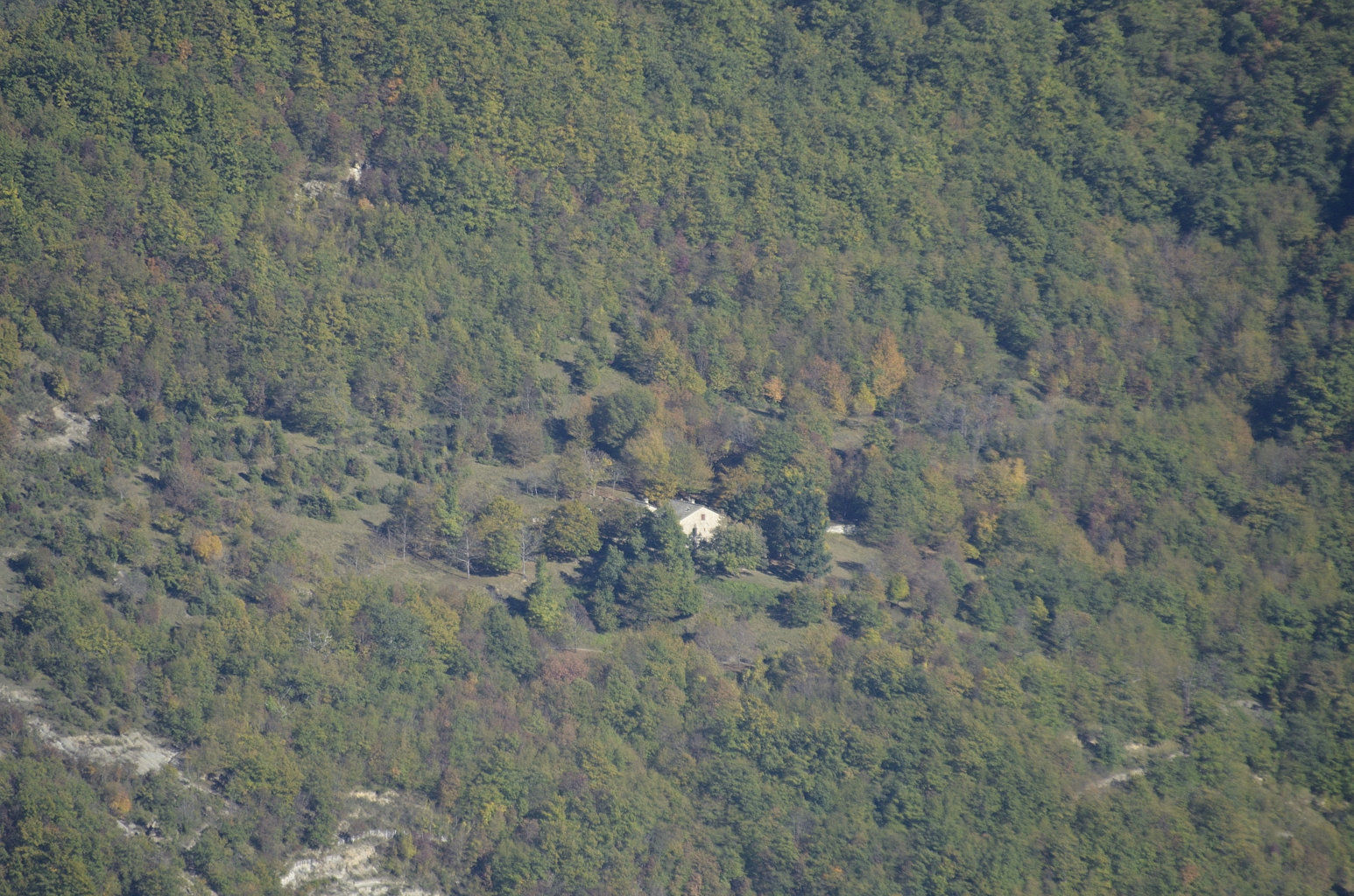 00a6/00a11 - Da Poggio Scali, la Valle del Rio Bacine guida lo sguardo fino al fondovalle, dove si nota il crinale percorso dalla Mulattiera Ridràcoli-Bagno che dalla Garfagnana raggiunge Le Caselle, per poi dirigersi verso la Valle dei Tagli (24/10/18).