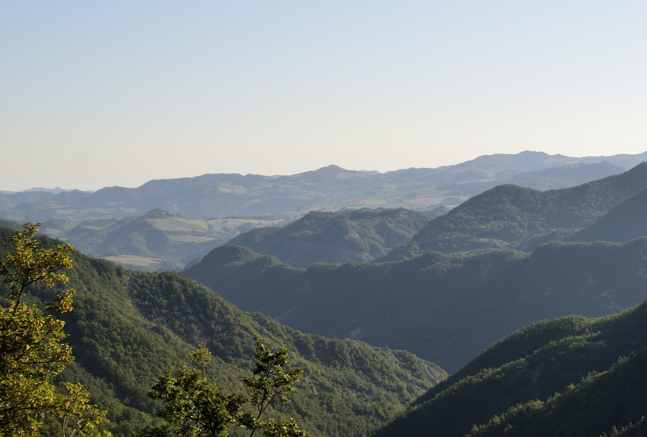 00d1 – 00d2 – 00d3 - Dai pressi di Strabatenza, vedute del tratto più stretto della valle di Pietrapazza: su un versante si nota l’incisione del Fosso delle Cannetole, proveniente dalla piega tra i Monti La Rocca e Marino, con la pendice ancora ritagliata dai prati dell’insediamento di Cannetole, che confluendo (presso Ca di Bogri) segna il termine del Bidente di Pietrapazza e l’inizio di quello di Strabatenza, sul versante opposto si notano i Monti Riccio e Piano (1/06/18).