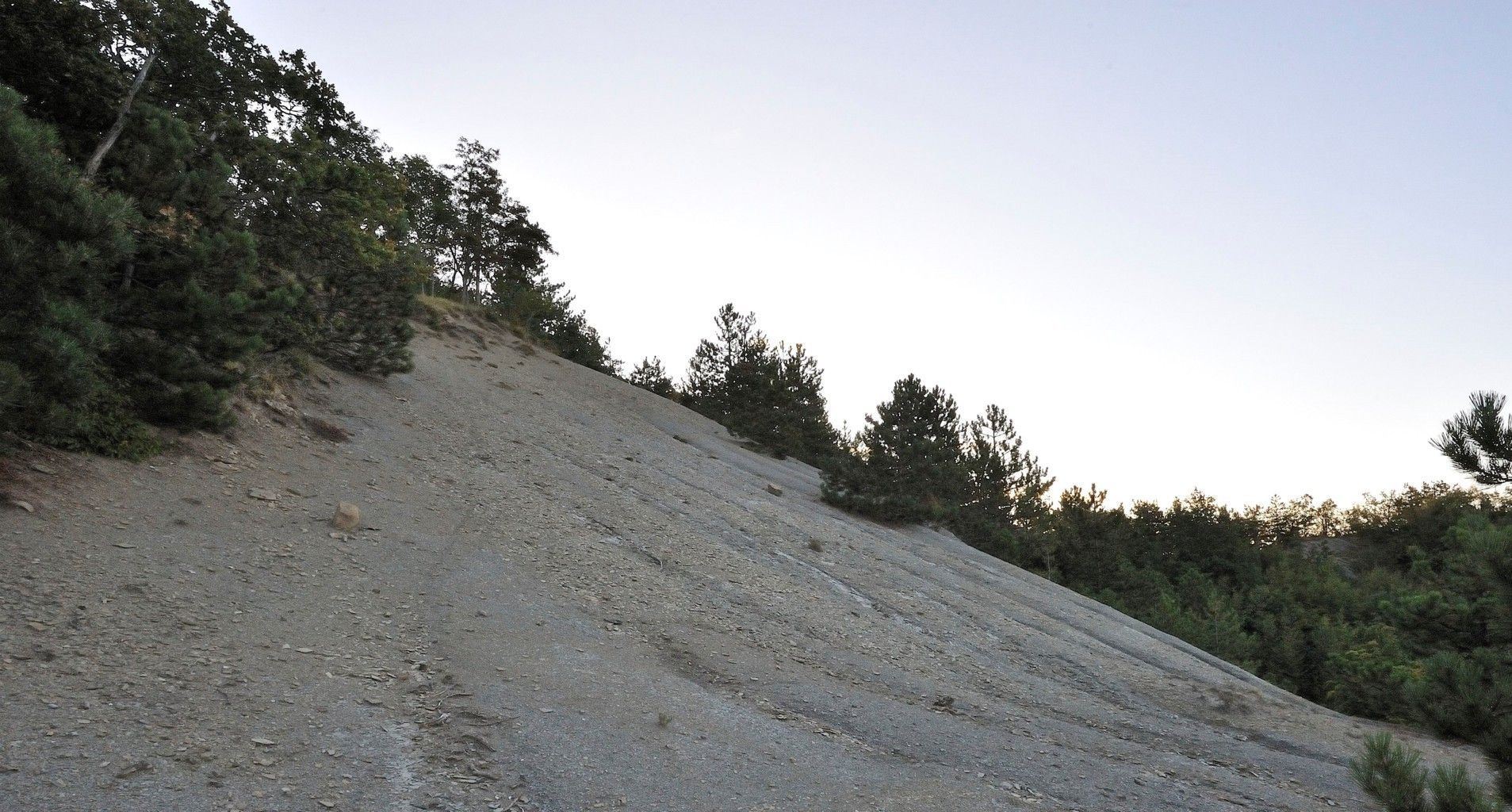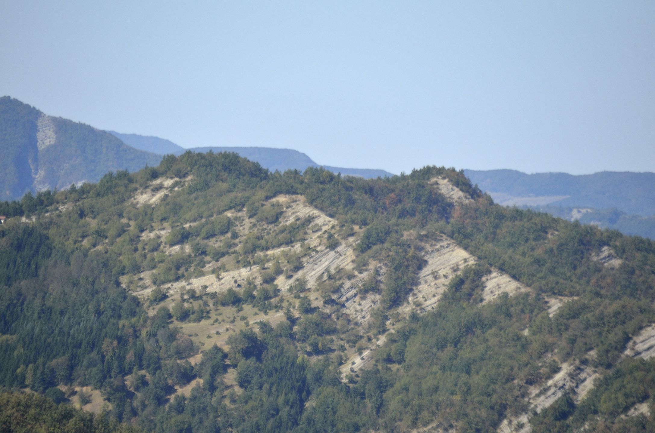 00e1/00e5 - Dalla pista che raggiunge Pratalino, panoramiche verso il Monte Moricciona, con il versante meridionale disposto a franapoggio, ovvero parallelo alla giacitura delle stratificazioni, pertanto sottoposto ad erosione (19/07/16 – 16/10/16 – 4/07/17 - 28/08/18).