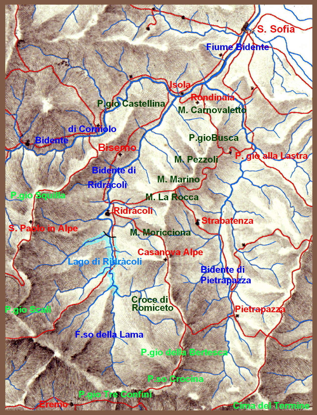 Nel contesto del sistema orografico del versante emiliano-romagnolo dell’Appennino Settentrionale, l’Alta Valle del Fiume Bidente nel complesso dei suoi rami di origine (delle Celle, di Campigna, di Ridràcoli, di Pietrapazza/Strabatenza), assieme alle vallate collaterali, occupa una posizione nord-orientale, in prossimità del flesso che piega a Sud in corrispondenza del rilievo del Monte Fumaiolo. L’assetto morfologico è costituito dal tratto appenninico spartiacque compreso tra il Monte Falterona e il Passo dei Mandrioli da cui si stacca una sequenza di diramazioni montuose strutturate a pettine, proiettate verso l’area padana secondo linee continuate e parallele che si prolungano fino a raggiungere uno sviluppo di 50-55 km: dorsali denominate contrafforti, terminano nella parte più bassa con uno o più sproni mentre le loro zone apicali fungenti da spartiacque sono dette crinali, termine che comunemente viene esteso all’insieme di tali rilievi: «[…] il crinale appenninico […] della Romagna ha la direzione pressoché esatta da NO a SE […] hanno […] orientamento, quasi esatto, N 45° E, i contrafforti (e quindi le valli interposte) del territorio della Provincia di Forlì e del resto della Romagna.» (P. Zangheri, 1961, rist.anast. 1989, p. 9, cit.). L’area, alla testata larga circa 18 km, è nettamente delimitata da due contrafforti principali che hanno origine, ad Ovest, «[…] dal gruppo del M. Falterona e precisamente dalle pendici di Piancancelli […]» (P. Zangheri, 1961, rist.anast. 1989, p. 14, cit.) e, ad Est, da Cima del Termine; in quell’ambito si staccano due contrafforti secondari e vari crinali e controcrinali minori delimitanti le singole vallecole del bacino idrografico. In particolare, le valli del Fiume Bidente di Ridràcoli e del Fiume Bidente di Pietrapazza sono separate dall’intero sviluppo del contrafforte secondario che si diparte da Poggio allo Spillo (collegando Poggio della Bertesca, Croce di Romiceto e il Monte Moricciona, quindi i Monti La Rocca, Marino, Pezzoli, Poggio Busca e il Monte Carnovaletto) per concludersi con il promontorio della Rondinaia digradando a valle di Isola costretto dalla confluenza del Fiume Bidentino o Torrente Bidente di Fiumicino nel Fiume Bidente. La Rondinaia è nota per il castello con la sua torre «[…] baluardo di antica potenza, elevato fin dai tempi romani alla difesa contro le orde barbariche che dal nord d’Europa scendevano a depredare le belle contrade d’Italia.» (D. Mambrini, 1935 – XIII, p. 274).