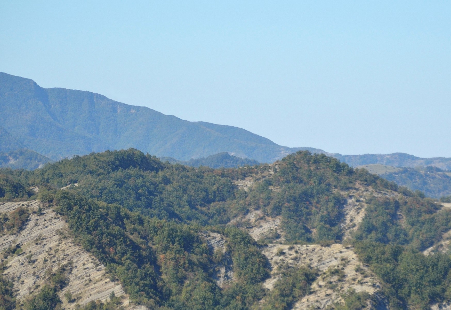 00a1/00a7 – Dal Monte Piano, sul contrafforte principale che si stacca da Cima del Termine, panoramica del pressoché intero contrafforte secondario da Poggio allo Spillo fino a Monte Pezzoli, con vedute ravvicinate della sella tra il poggio di Croce di Romiceto e quello adiacente, dove si riesce a vedere la Maestà di Valdora, con il fondale dello Spartiacque Appenninico (1/10/12).