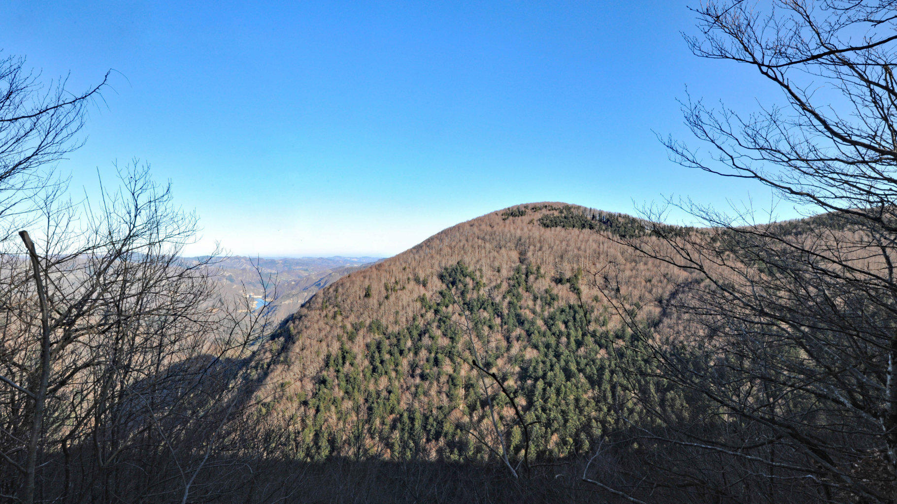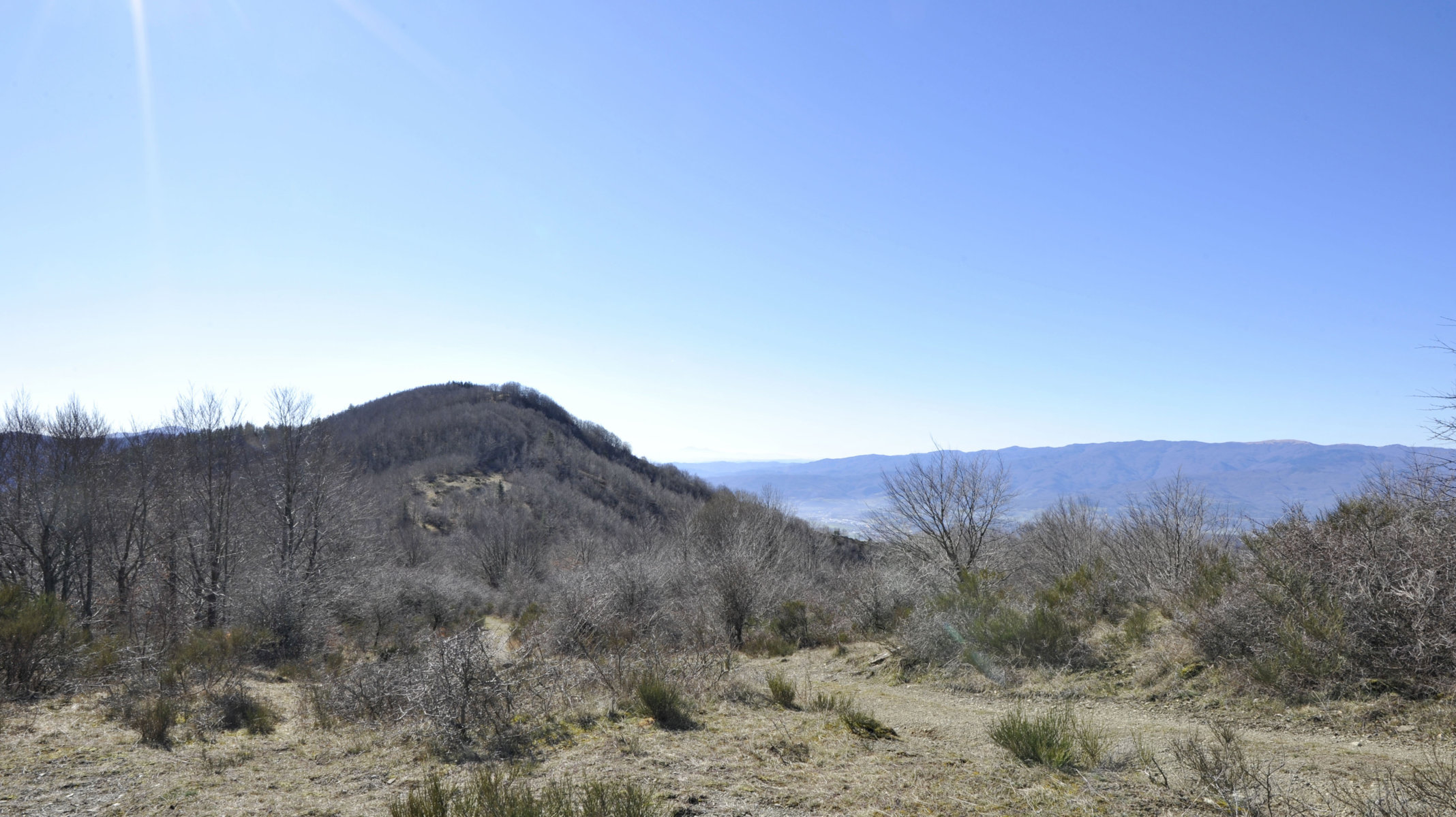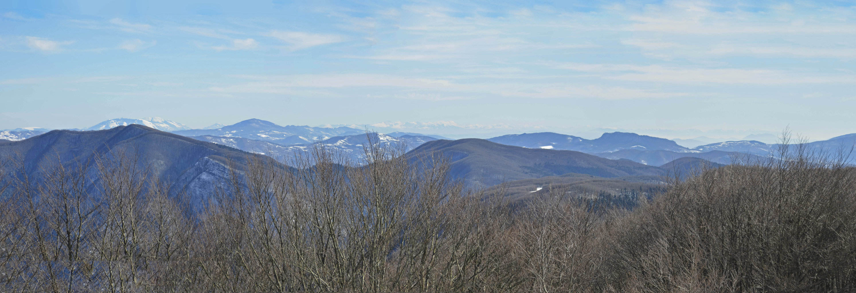 00a1 – 00a2 - Da Poggio Scali, panoramica e veduta del disallineamento dello Spartiacque che crea la sella del Passo dei Fangacci tra Poggio Tre Confini e la dorsale che risale verso Poggio allo Spillo: nell’effetto prospettico che pare saldare il Monte Penna alla dorsale occorre notare la perfetta omogeneità della giacitura degli strati, ovvero il perfetto parallelismo stratigrafico (5/02/11).
