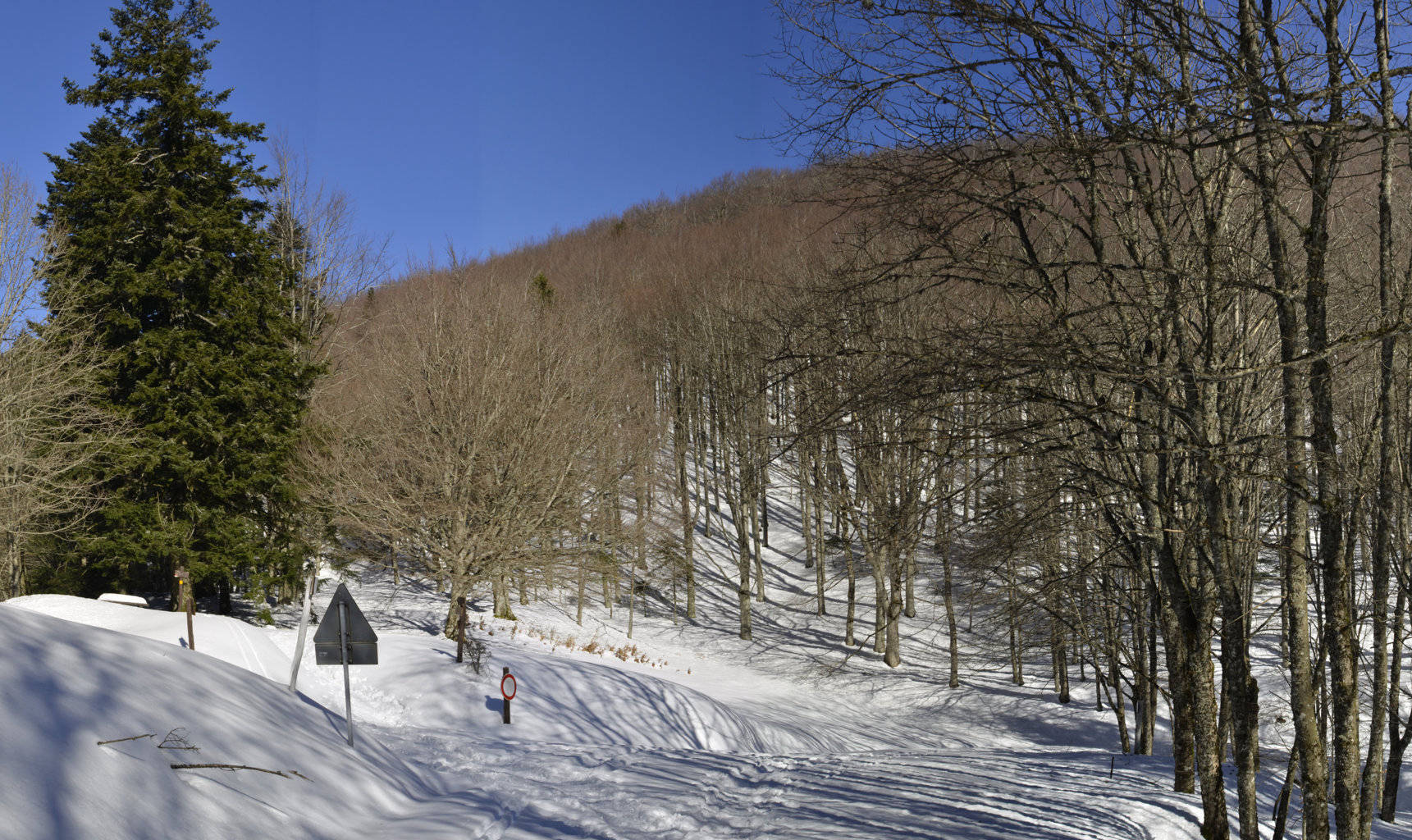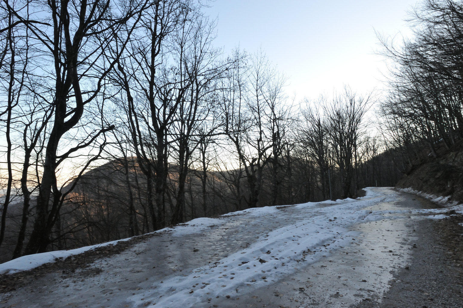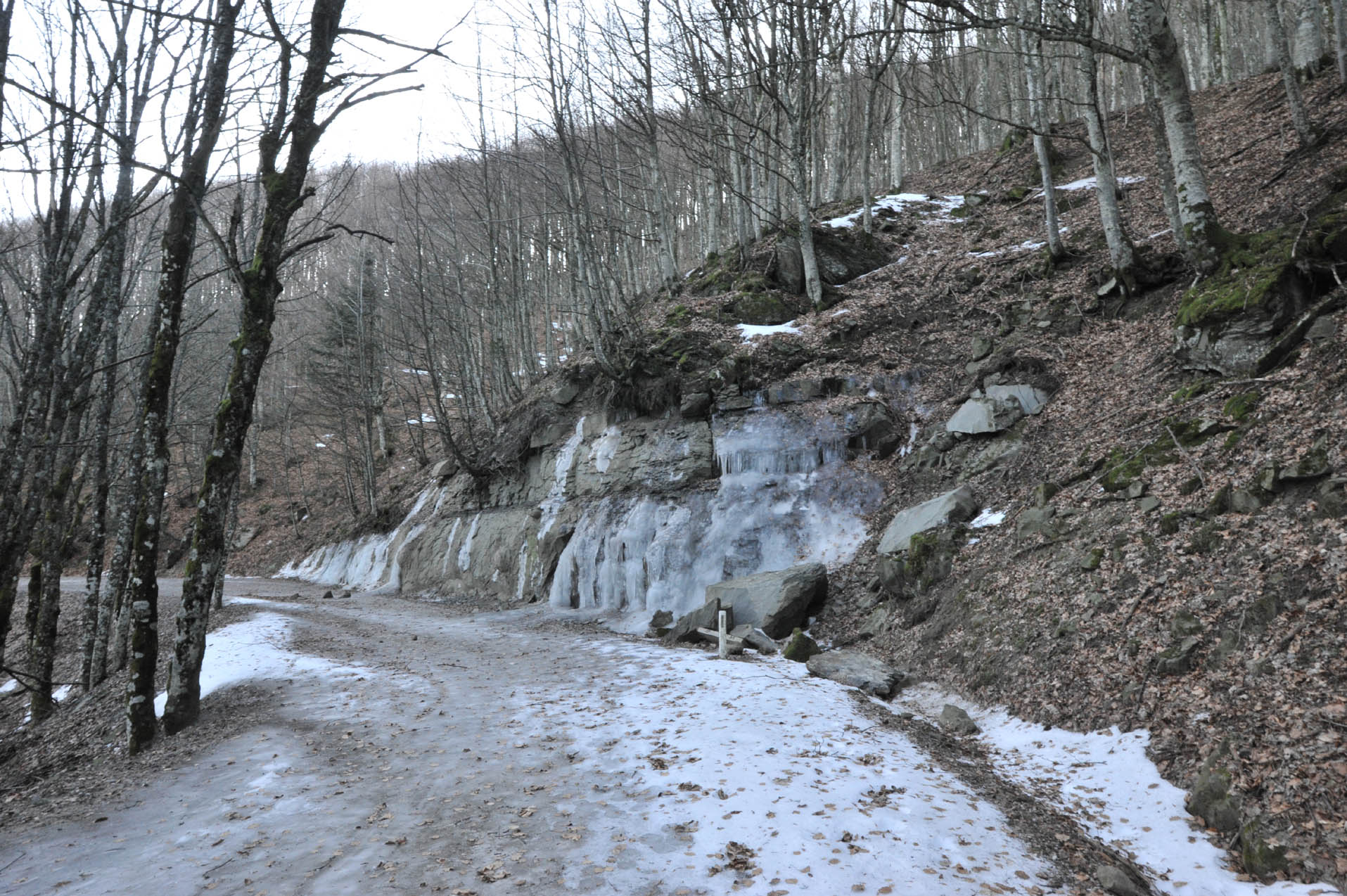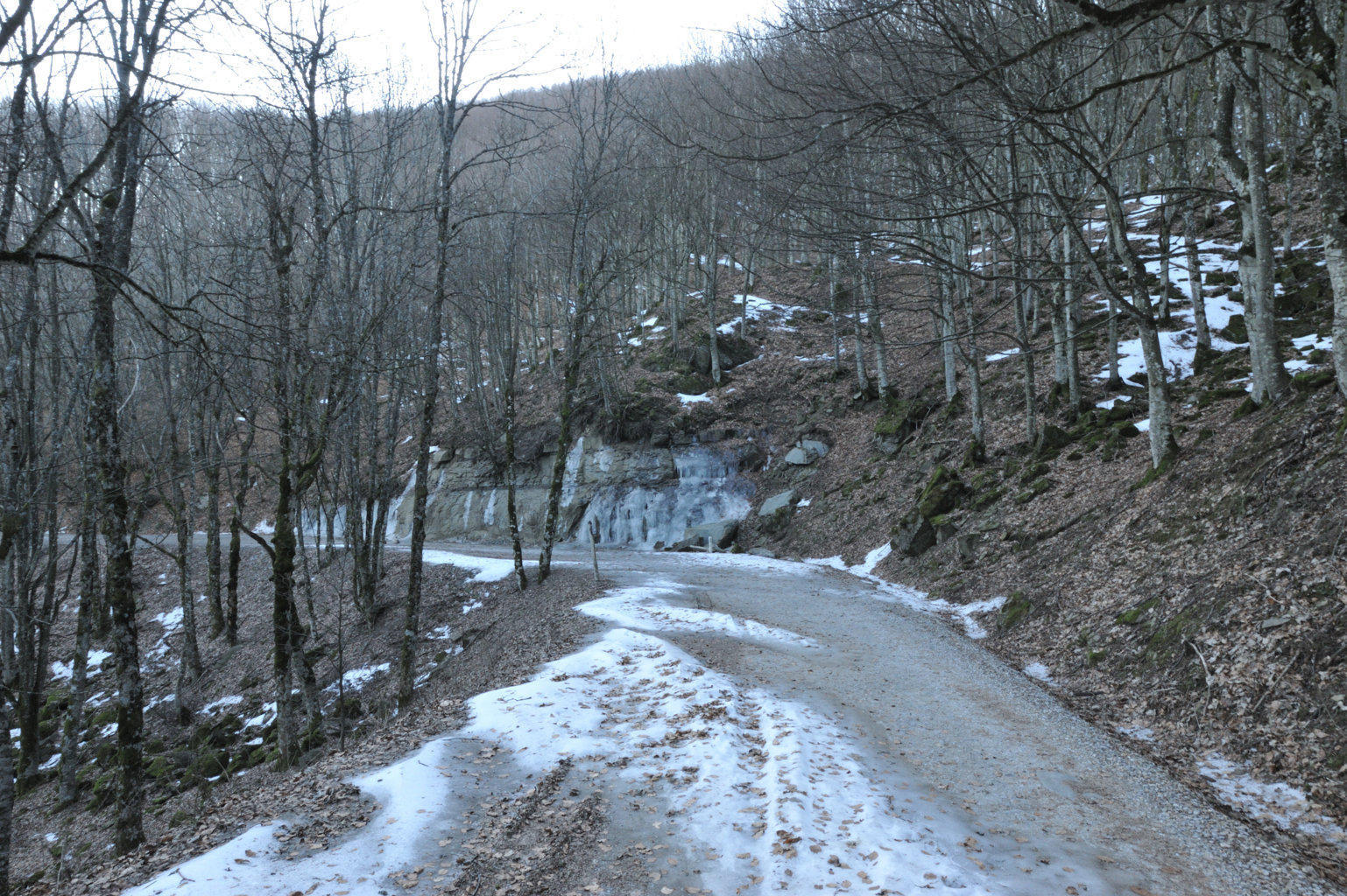 00e1 – 00e2 - 00e3 – Vedute del tratto della Strada della Bertesca tra il rifugio e l’Aia di Guerrino riutilizzato dalla provinciale, ma sul pendio sulla sx pare di individuare la traccia della via antica (7/02/11 - 26/01/12 – 26/05/23).