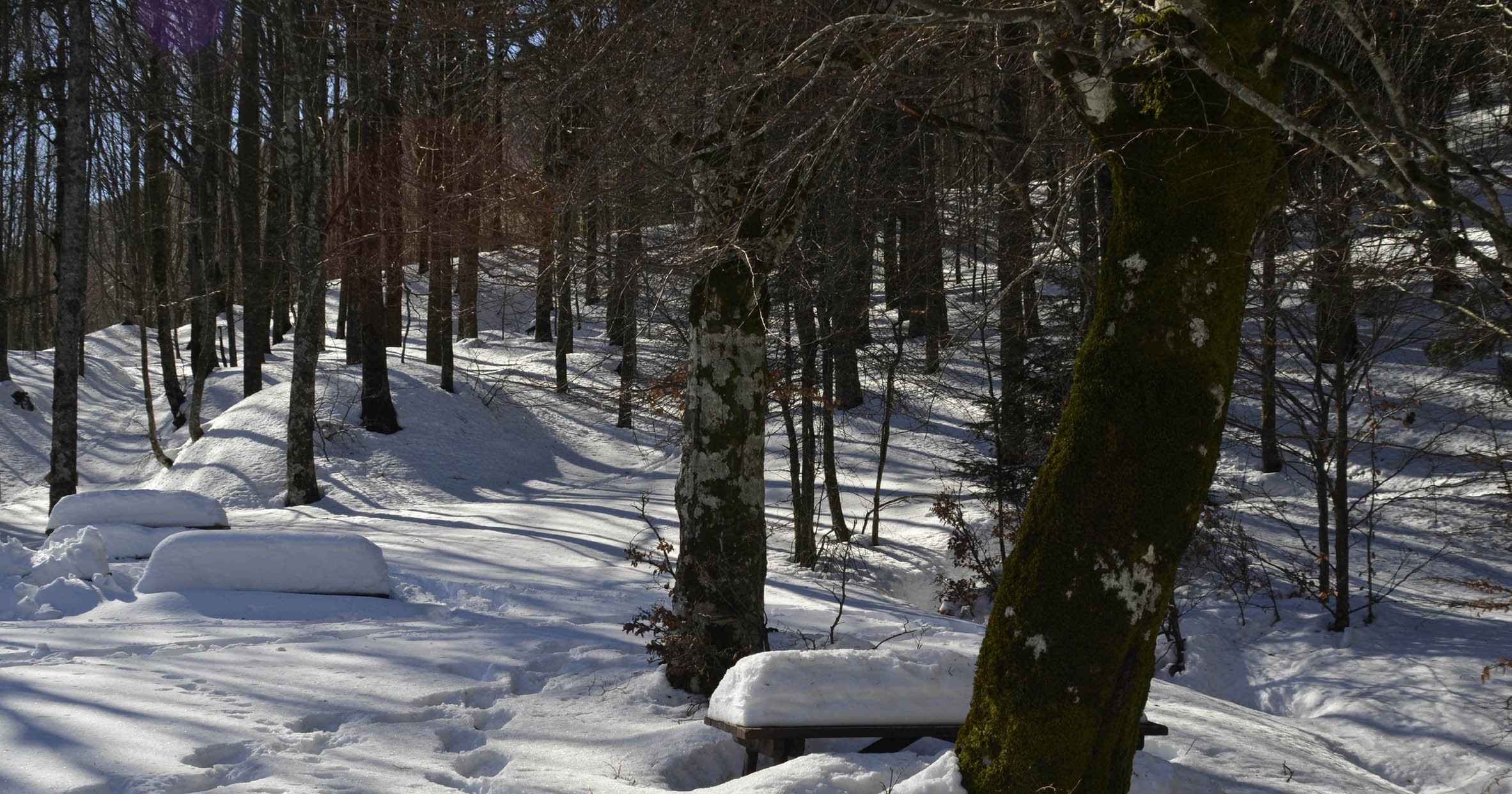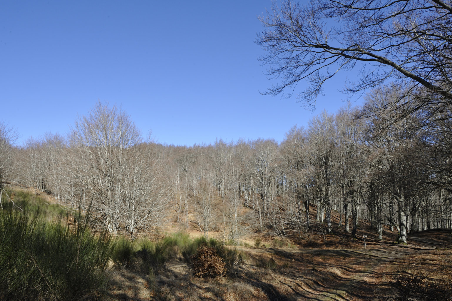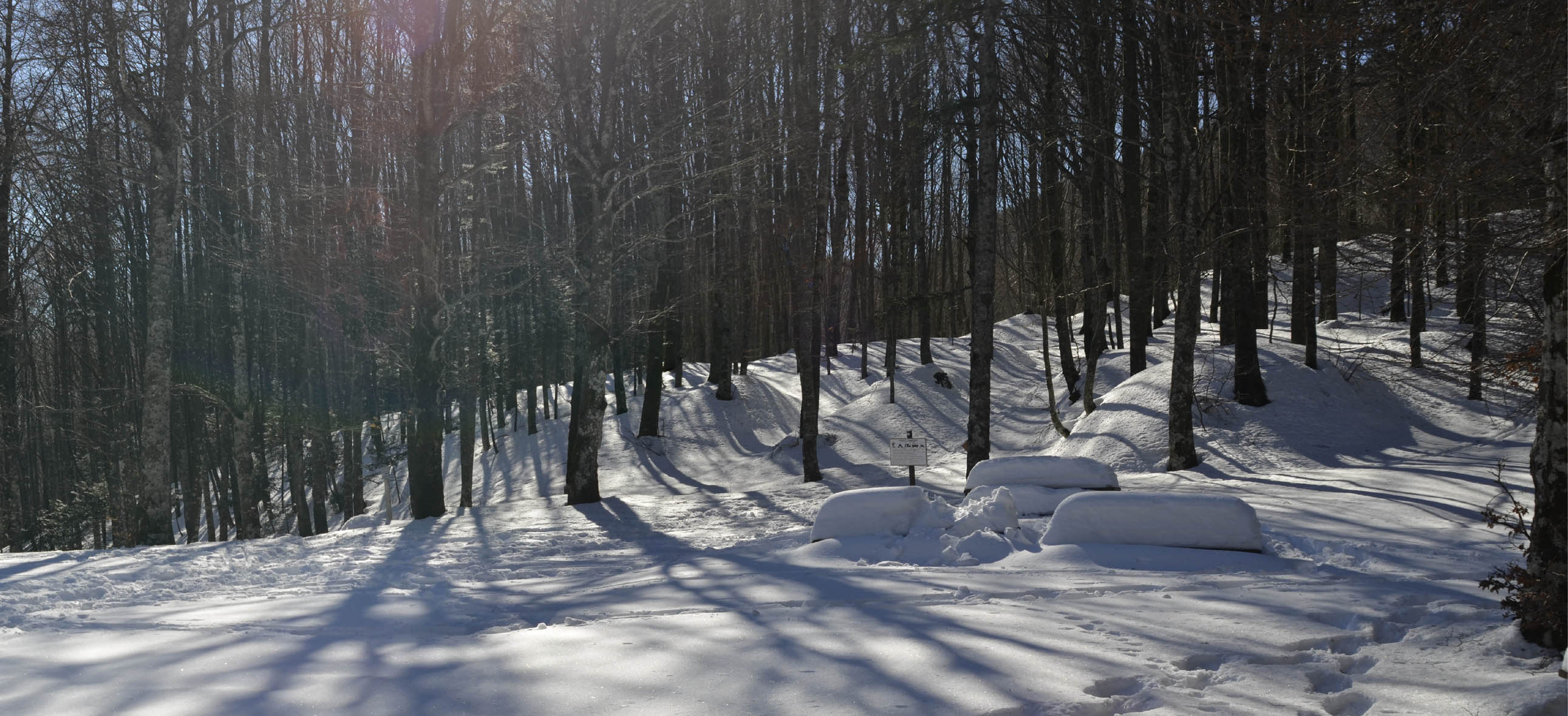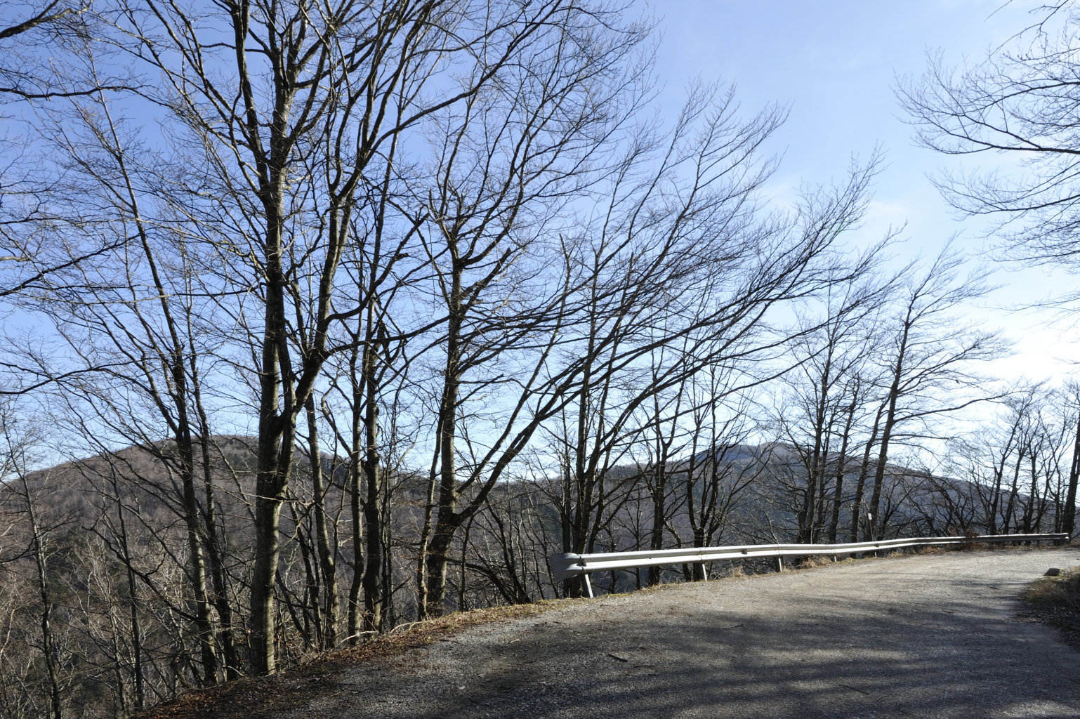 00e1 – 00e2 - 00e3 – Vedute del tratto della Strada della Bertesca tra il rifugio e l’Aia di Guerrino riutilizzato dalla provinciale, ma sul pendio sulla sx pare di individuare la traccia della via antica (7/02/11 - 26/01/12 – 26/05/23).