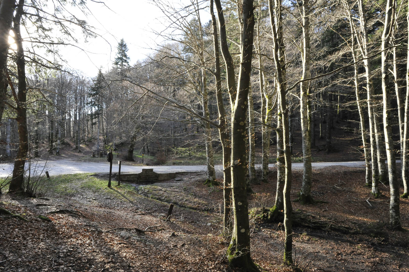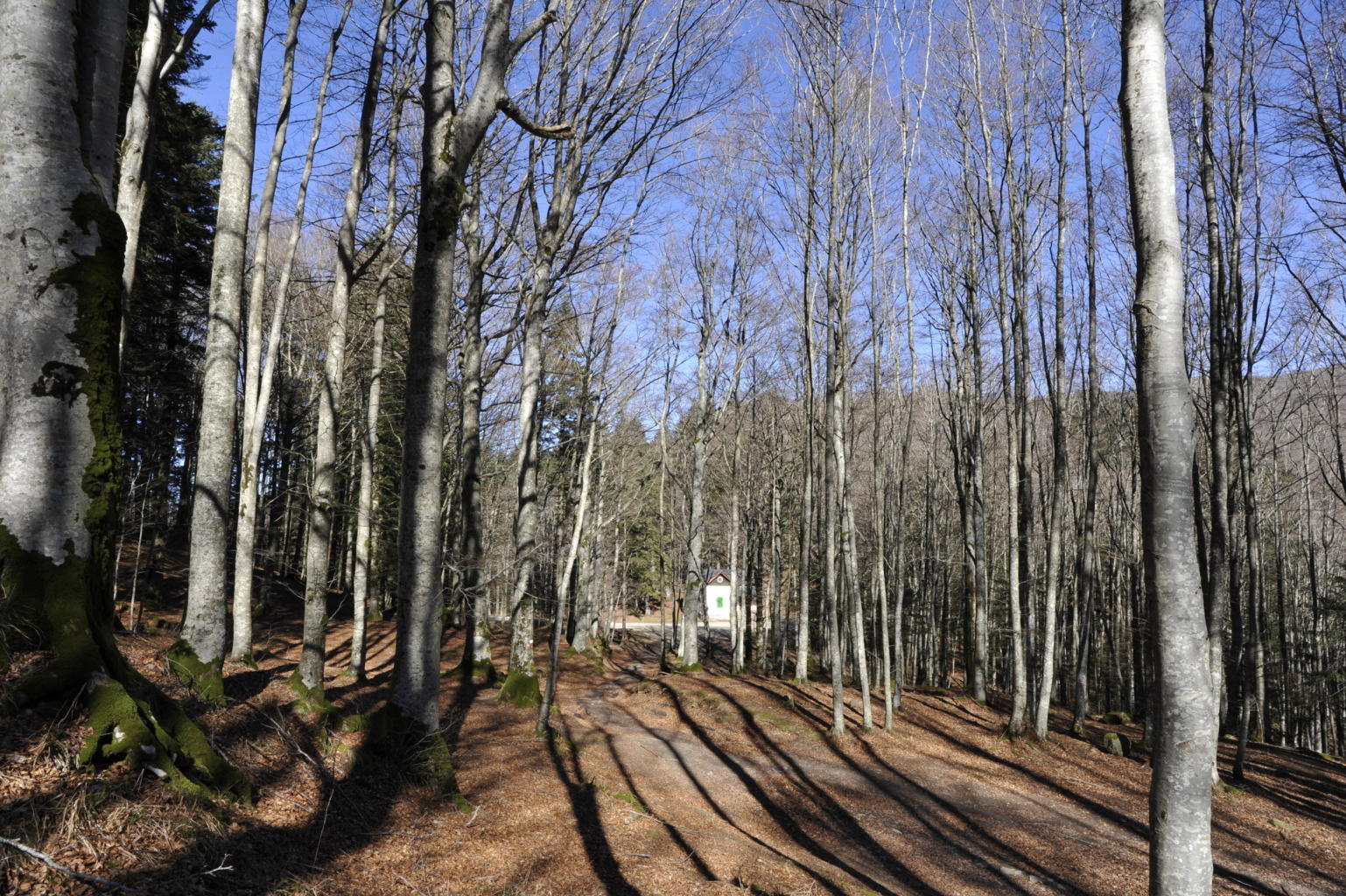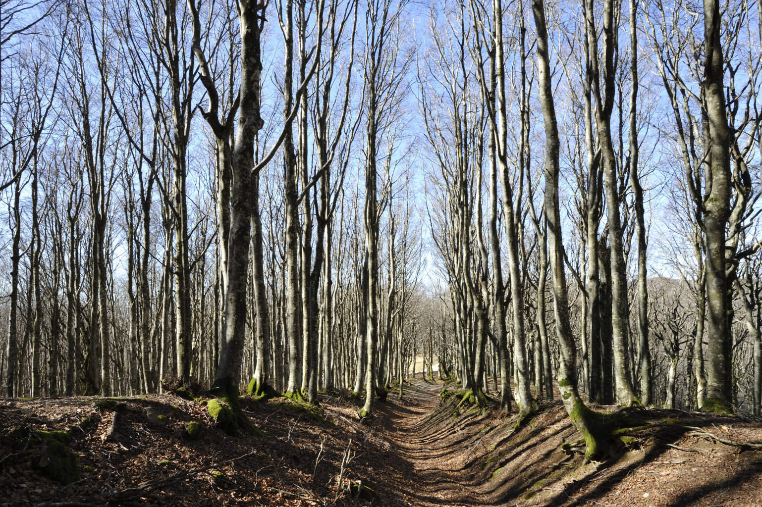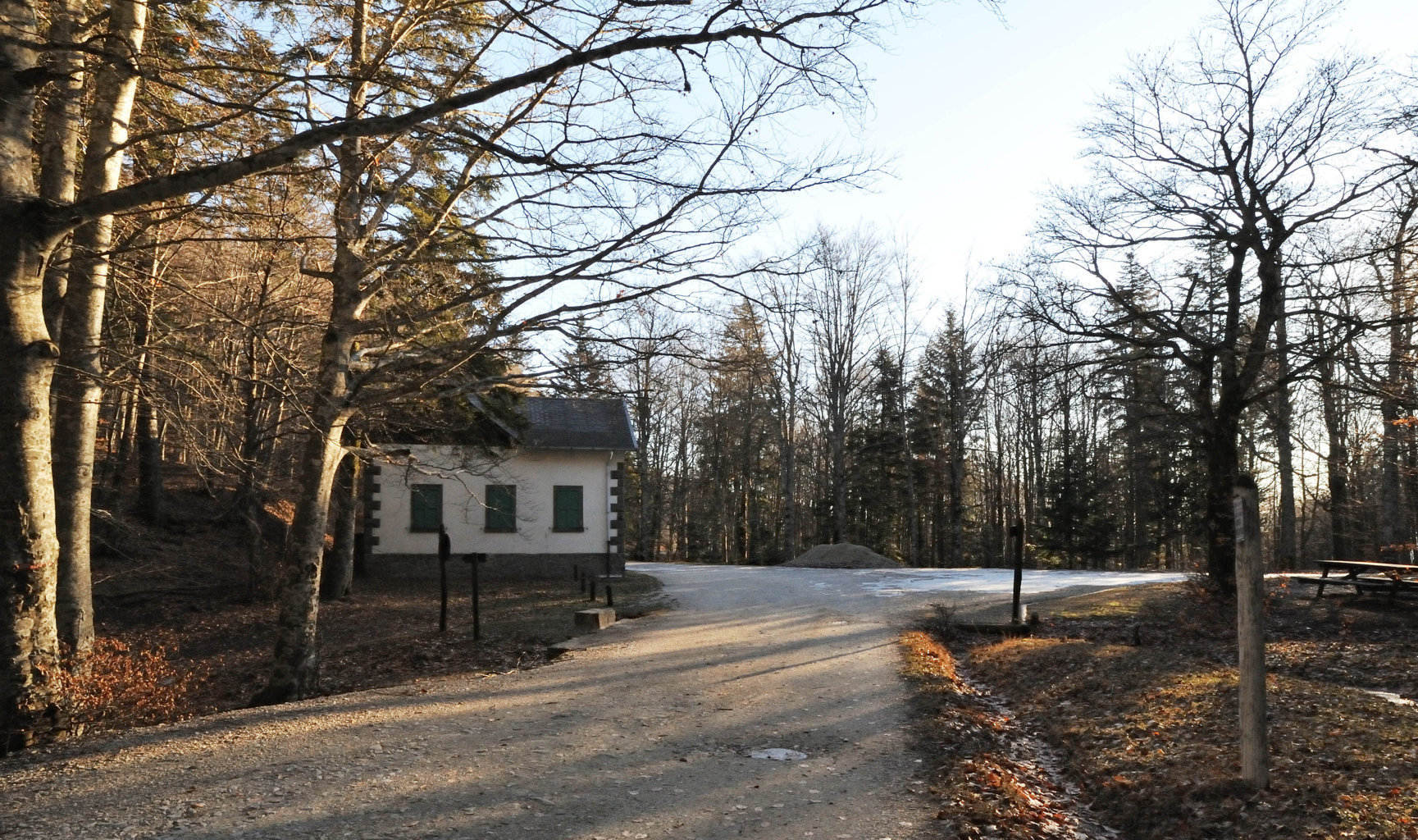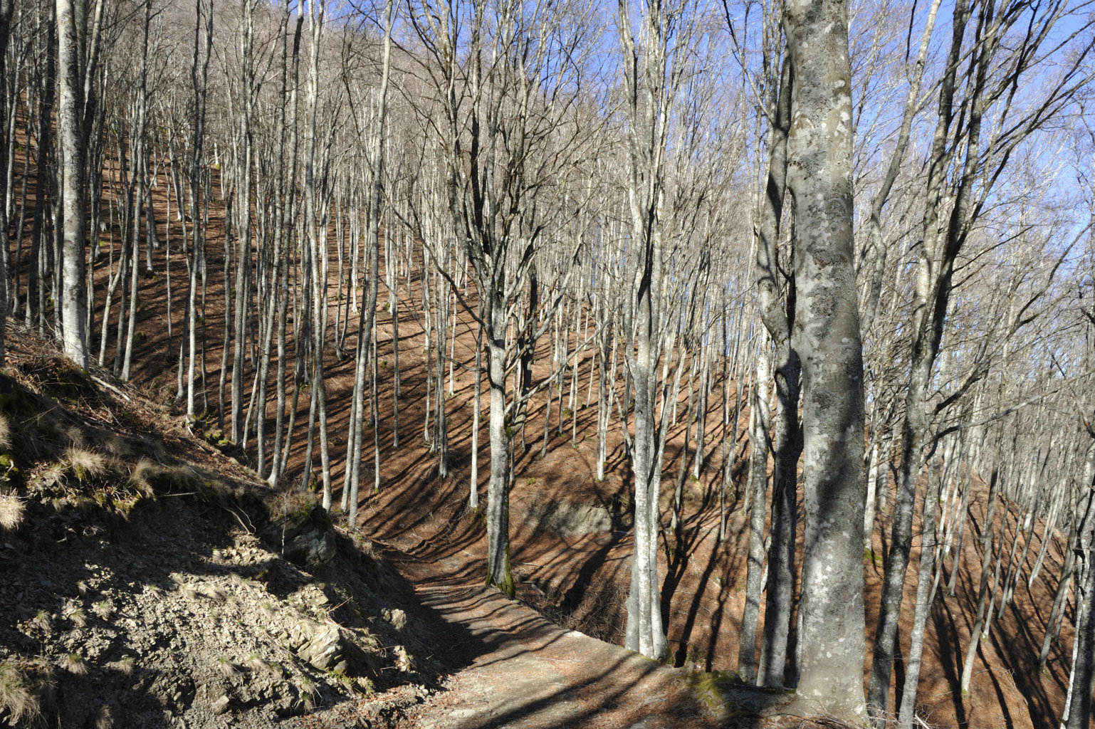 00e1 – 00e2 - 00e3 – Vedute del tratto della Strada della Bertesca tra il rifugio e l’Aia di Guerrino riutilizzato dalla provinciale, ma sul pendio sulla sx pare di individuare la traccia della via antica (7/02/11 - 26/01/12 – 26/05/23).