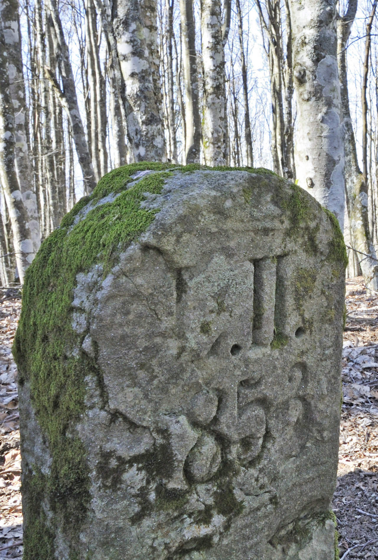 Per esaminare alcuni aspetti di rilievo storico che hanno interessato l’area di Fangacci e l’itinerario di valico verso la Romagna, occorre anzitutto ricordare che la Giogana da Giogo Seccheta a Poggio Tre Confini fu oggetto di controversia tra confinanti, come documentato fin dal 1663. In occasione della generale opera di miglioramento della viabilità avviata a partire dal 1838 Siemoni dovette aprire una disputa con i camaldolesi riguardo alcuni tratti di confine, conclusa successivamente, come risulta dall’atto notarile del 1857 relativo all’acquisto delle foreste dell’Opera da parte di Leopoldo II. Dall’atto si apprende che la disputa si risolse ricorrendo, tra il 1855 e il 1856, all’apposizione di 91 “termini di pietra” numerati sulla Giogana tra Poggio Tre Termini (Poggio Tre Confini) e Giogo Seccheta. Il posizionamento dei cippi, che non vennero tutti impiantati, fu riportato in una mappa allegata alla Relazione della Confinazione e apposizione di Termini fra R. Foresta di S.ta Maria del Fiore e R.R. Padri Eremiti di Camaldoli (cfr. M. Ducci, G. Maggi, 2022, pp. 82-85, cit. e 676 Estimi dei vari territori e altre carte relative alla tenuta della Marinese e alla R. Foresta di S. Maria del Fiore, secc.XVIII-XIX, c. 266-267, in: https://archiviodistatofirenze.cultura.gov.it/archividigitali/riproduzione/?id=176079&ua=276). I cippi avevano su una faccia l’incisione L.II.1853 e sull’altra l’emblema camaldolese del calice: «I Termini sono di Pietra della specie dell’arenarie alti B. 1,00 in circa sopra terra, larghi B. 0,50 e grossi B. 0,30 in circa, di figura circolare nella estremità superiore. Da una vi sono scolpiti L. II. 1853 indicante Leopoldo Secondo, e dall’altra parte il Calice stemma della Religione Camaldolense. / Sono collocati alla media profondità di B. 1.25mi, secondochè lo permetteva la natura del suolo ed intorno ad essi i soliti Testimoni consistenti in frantumi di terre cotte di stoviglie e colaticci provenienti dalla fornace del cristallo / E sono inoltre numerati per mezzo dello scalpellino incominciando dal N° 1 fino al N° 90.» (Confinazione ed Apposizione di Termini fra la R. Foresta di S.ta Maria del Fiore in Romagna e la tenuta Forestale di ragione dei RR PP Eremiti di Camaldoli, in: M. Ducci, G. Maggi, 2022, p. 90, cit. e 676 Estimi dei vari territori e altre carte relative alla tenuta della Marinese e alla R. Foresta di S. Maria del Fiore, secc.XVIII-XIX, c. 280-281, in: https://archiviodistatofirenze.cultura.gov.it/archividigitali/riproduzione/?id=176079&ua=276). Nel crinale in piccola parte i cippi si sono mantenuti (17 dei 60 posti nell’Ottocento) o qualcosa può averne impedito il collocamento effettivo (M. Ducci, G. Maggi, B. Roba, 2024, pp. 163-164, cit.).