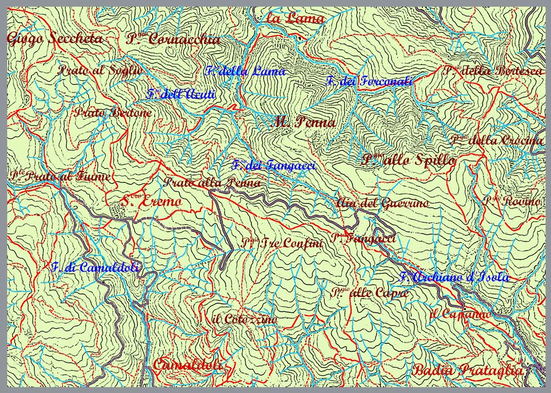 Fino al Sei-Settecento per l’area della sella erano noti i toponimi Beventi e Fonte dei Beventi, evidentemente guadagnati per la ventosità che vi si incalanava. Nel 1605 Beventi era un “luogo da aggirare e seminare abeti”; nel 1652 un funzionario dell’Opera relaziona di “una spiaggia che si dice i Beventi luoghi tutti coperti per lo più di faggi non d’abeti” posta sopra La Lama verso i crinale; nella citazione soprariportata relativa al contratto del 1818 tra l’Opera e i camaldolesi si accenna al “crine dei Beventi” e alla “Fonte dei Beventi o del Gioghetto”, ma solo nel 1824, nella specifica mappa del Catasto toscano (Sezione A, Foglio 2o) oltre alla Fonte del Gioghetto compare il toponimo Fangacci ed occorre attendere la fine del secolo e la pubblicazione del Foglio 107 II della Carta d’Italia I.G.M., rilevato nel 1893, per trovare trascritto il toponimo P.so dei Fangacci, quando la nuova Strada ordinaria a fondo artificiale (futura S.P. n.69 dell’Eremo) ancora non lo raggiungeva, fermandosi all’Eremo. Nel catasto antico la strada che dall’Eremo giungeva al passo è detta Via della bertesca e quella che proseguiva fino al Passo della Crocina (detto Sodo di Rombicetino) è la Via dall’Eremo in Romagna, ma era detta anche strada dei Fangacci e della Bertesca che nelle Bozze di mappe catastali diviene Strada di legni che va alla Bertesca, a segnalarne l’utilizzo promiscuo. Oggi si ripercorre prevalentemente il tracciato antico sul versante meridionale di Poggio allo Spillo (ma in base alle mappe tendeva ad avvicinarsi al crinale, probabilmente in coincidenza di evidenti tracce), attraversando il complesso forestale della Foresta di Fiume d’Isola della Riserva Naturale Badia Prataglia; il poggio evidenzia due picchi che a metà ‘800 erano differenziati nel già accennato Poggio delle Ripe Bianche, riguardante quello occidentale oggi anonimo, e in Poggio dello Spillo. Nella Pianta dimostrativa di una porzione della tenuta della Badia a Prataglia di proprietà del Sig. Filippo Biondi di Bibbiena, risalente al 1846 (cfr.: M. Ducci, G. Maggi, B. Roba, 2024, p. 173, cit. e https://www502.regione.toscana.it/searcherlite/cartografia_storica_regionale_start.jsp), anche il tratto che attraversa il Passo dei Fangacci era detto Strada dei Legni forse ricomprendendo la via che ancora vi giunge da Badia Prataglia tramite Vetriceta. In alto si affiancava una Via delle terre rosse diretta verso l’Aia di Guerrino, presso la quale una breve e moderna pista forestale in dx idrografica del fosso consente di raggiungere la Fonte di Guido. Il toponimo Aia di Guerrino compare per la prima volta nella Carta d’Italia di rilevata nel 1937 ed oggi il luogo è noto come Area di sosta. Nell’ambito del Programma LIFE e del progetto WetFlyAmphibia (conservazione di anfibi e farfalle di aree umide e loro habitat nel Parco delle Foreste Casentinesi), presso la Fonte di Guido è stata realizzata una vasca abbeveratoio per anfibi ed ungulati. Le specie interessate dal progetto sono l’Ululone dal ventre giallo (Bombina variegata), la Salamandrina dagli occhiali (Salamandrina tergiditata) e il Tritone crestato (Triturus carnifex). In tale occasione è stata anche risistemata l’area e la fonte stessa è stata nuovamente restaurata. Al passo giungeva inoltre da Mezzogiorno, versante di Serravalle, la Via dei nespoli (oggi 66 CAI) mentre una via segnata nelle mappe di metà e fine ‘800 in sx del Fosso dei Fangacci consentiva di raggiungere La Lama da Badia Prataglia: un primo tratto dal rifugio fin quasi all’attraversamento del fosso è poi divenuto parte del noto Sentiero degli Scalandrini (227 CAI), con la celebre cascata, mentre rimangono consistenti tracce del restante percorso abbandonato che va ad immettersi nella Strada degli Acuti mantenendosi in sx idrografica.