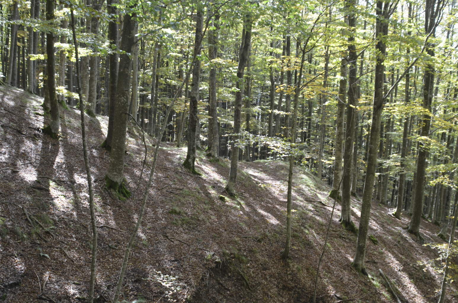 037/040 – Dai precisi raffronti storico-cartografici consentiti dal sito www502.regione.toscana.it/geoscopio/castore.html è possibile localizzare nell’evidente traccia di cui alle seguenti vedute il punto da cui la Via della fonte del prete abbandonava il sent. 00 per scendere verso Badia Prataglia in collegamento con il Passo della Crocina diversamente dall’odierno sent. 64, tracciato allora inesistente o non classificato come mulattiera o sentiero