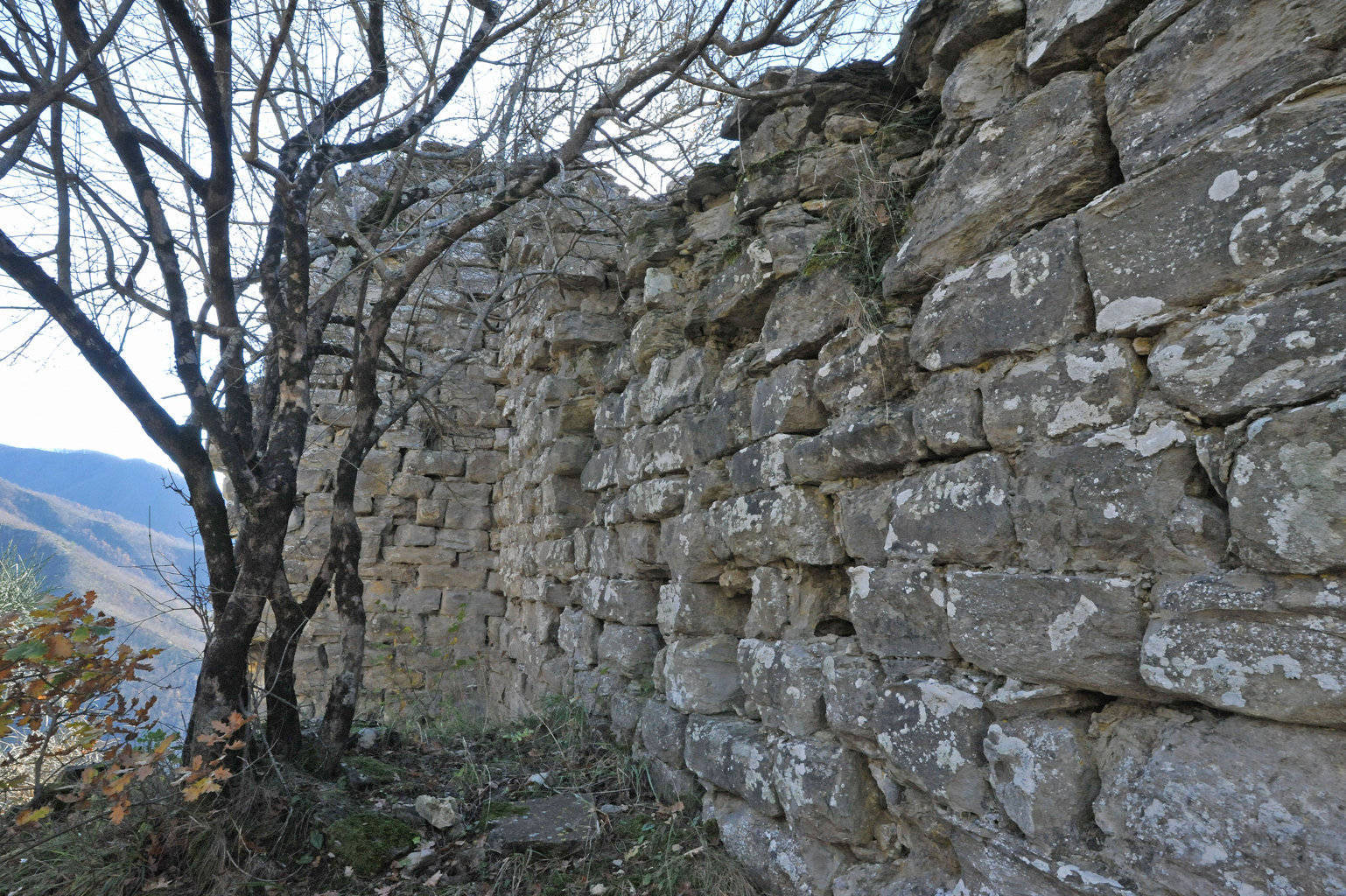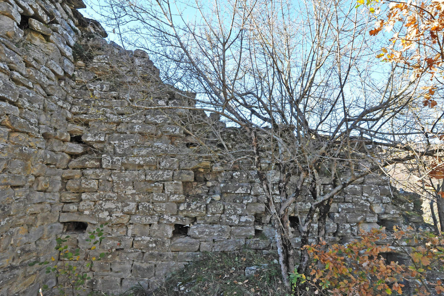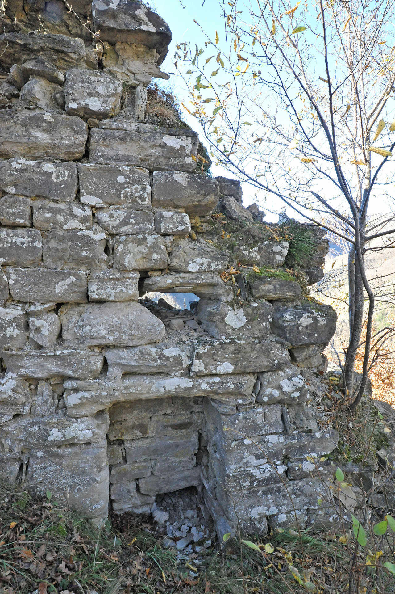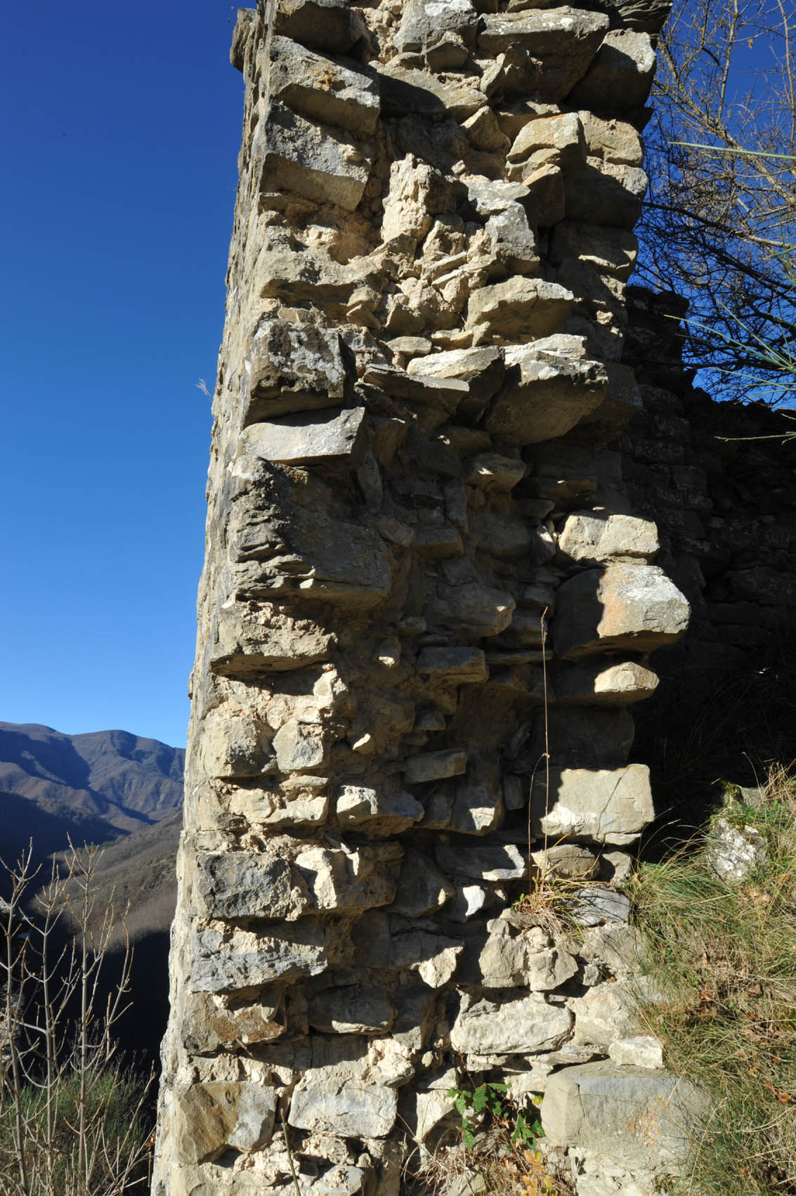 004a/004r – Il mastio e la cinta muraria evidenziano la tipologia muraria in elementi “da sbozzatore” e “da muratore” (squadrati tramite sbozzatura sommaria e non lavorati o al massimo spaccati, come la formazione marnoso-arenacea permette di ottenere quasi naturalmente senza particolari supplementi di lavorazione) in cui si riconoscono nicchie, feritoie e fori di scarico (11/09/16 - 30/11/16).