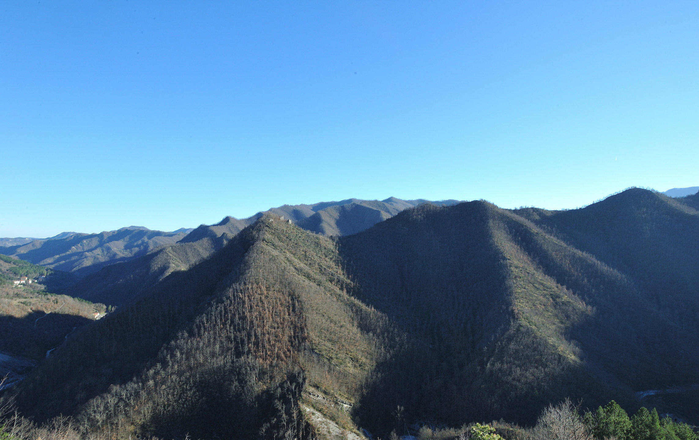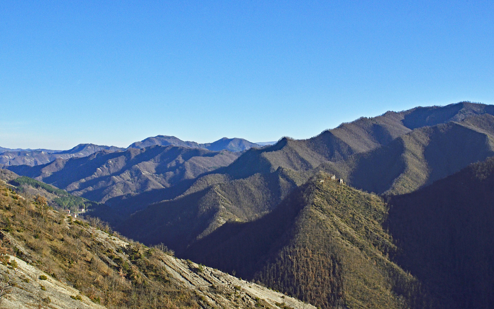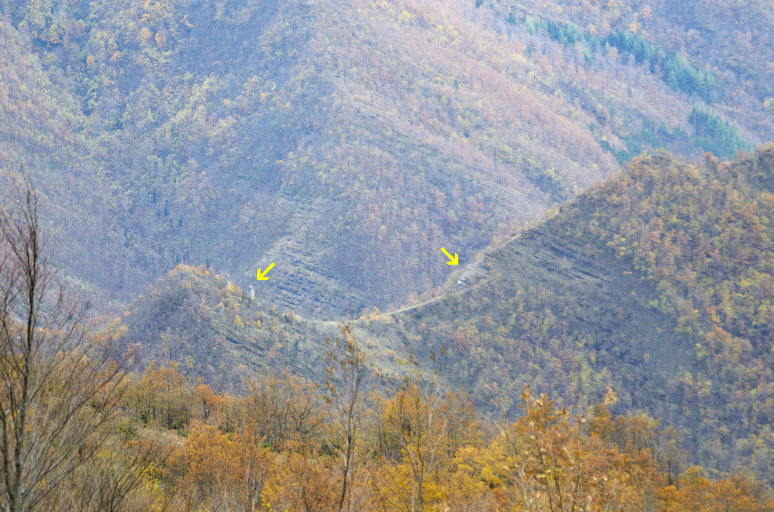 00d1/00d7 – Dall’antica mulattiera che da Capria di Sopra risale nella valle di Lavacchio, vedute del tratto terminale dello spartiacque terziario in sovrapposizione prospettica con i crinali adiacenti ed in particolare quello del gemello minore con il picco di Poggio Aguzzo, dove probabilmente sorgeva una postazione di sorveglianza (8/12/16 – 10/12/16).