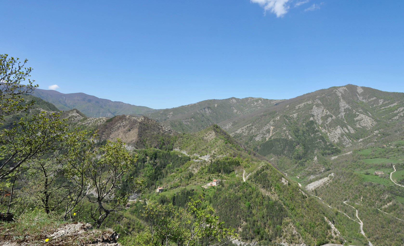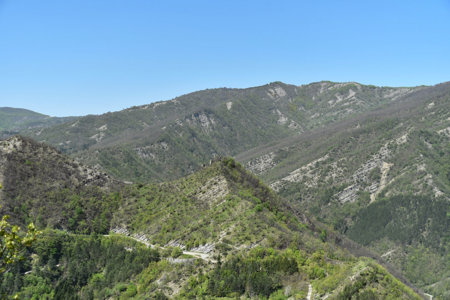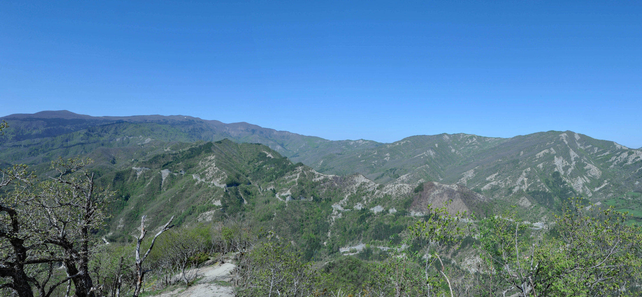 00e1/00e6 – Dal crinale tra Poggio Squilla e Poggio Aguzzo panoramica e vedute della valle di Campigna fino allo Spartiacque Appenninico dove si nota il netto profilo della sequenza di poggi cui appartiene il Monte della Maestà, con vista ravvicinata del del picco del Castellaccio e della sella con lo sbalzo dove si ritiene sorgesse la Torre della Rovere (25/04/18).