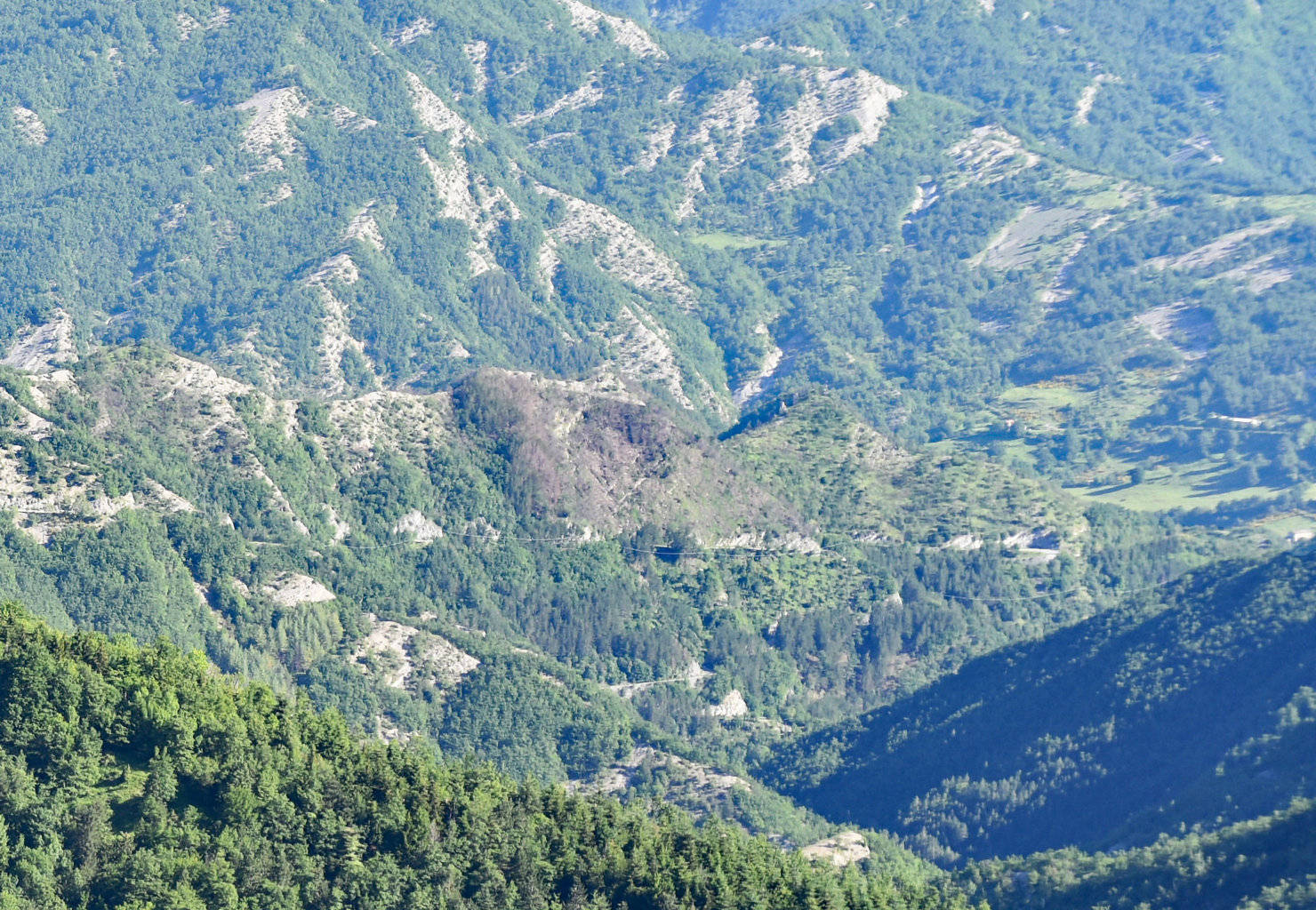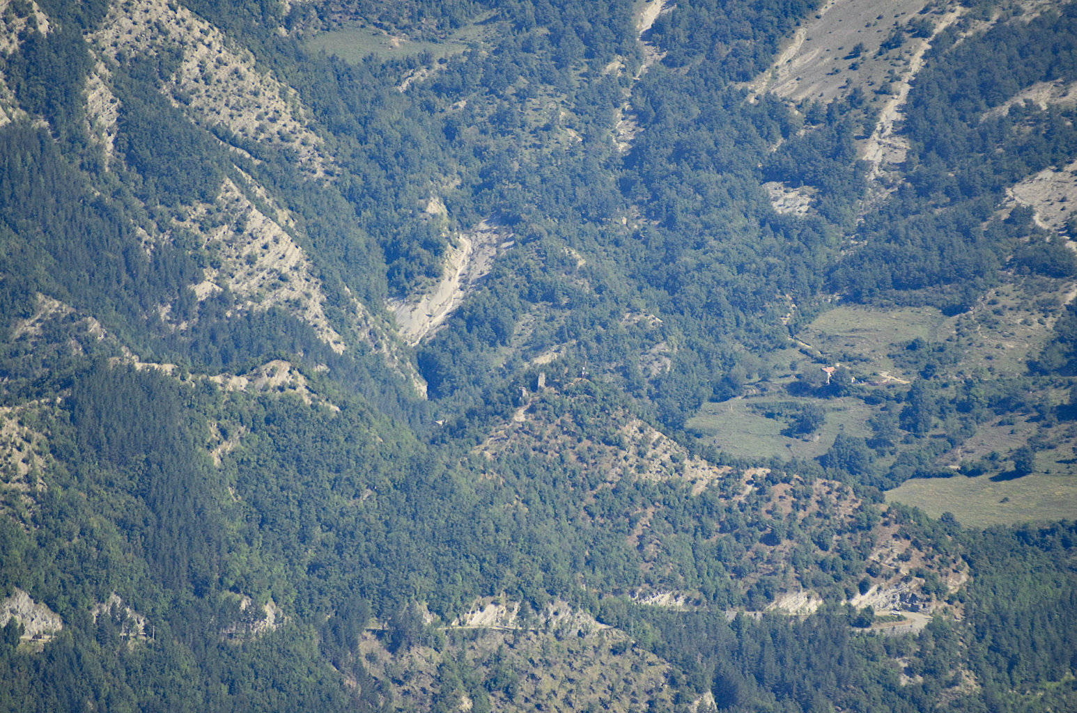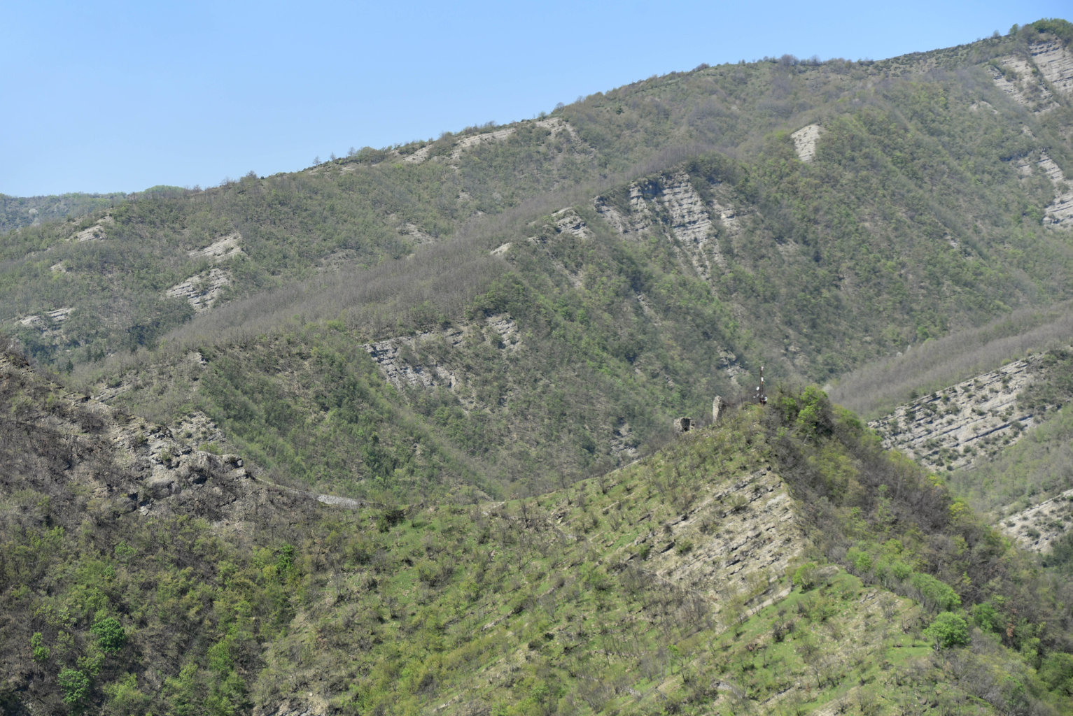 00e1/00e6 – Dal crinale tra Poggio Squilla e Poggio Aguzzo panoramica e vedute della valle di Campigna fino allo Spartiacque Appenninico dove si nota il netto profilo della sequenza di poggi cui appartiene il Monte della Maestà, con vista ravvicinata del del picco del Castellaccio e della sella con lo sbalzo dove si ritiene sorgesse la Torre della Rovere (25/04/18).