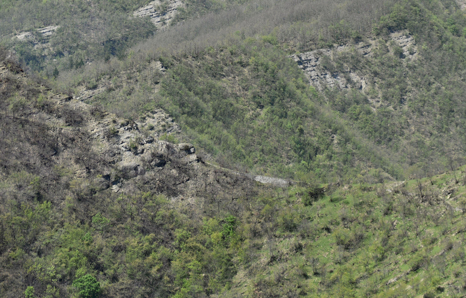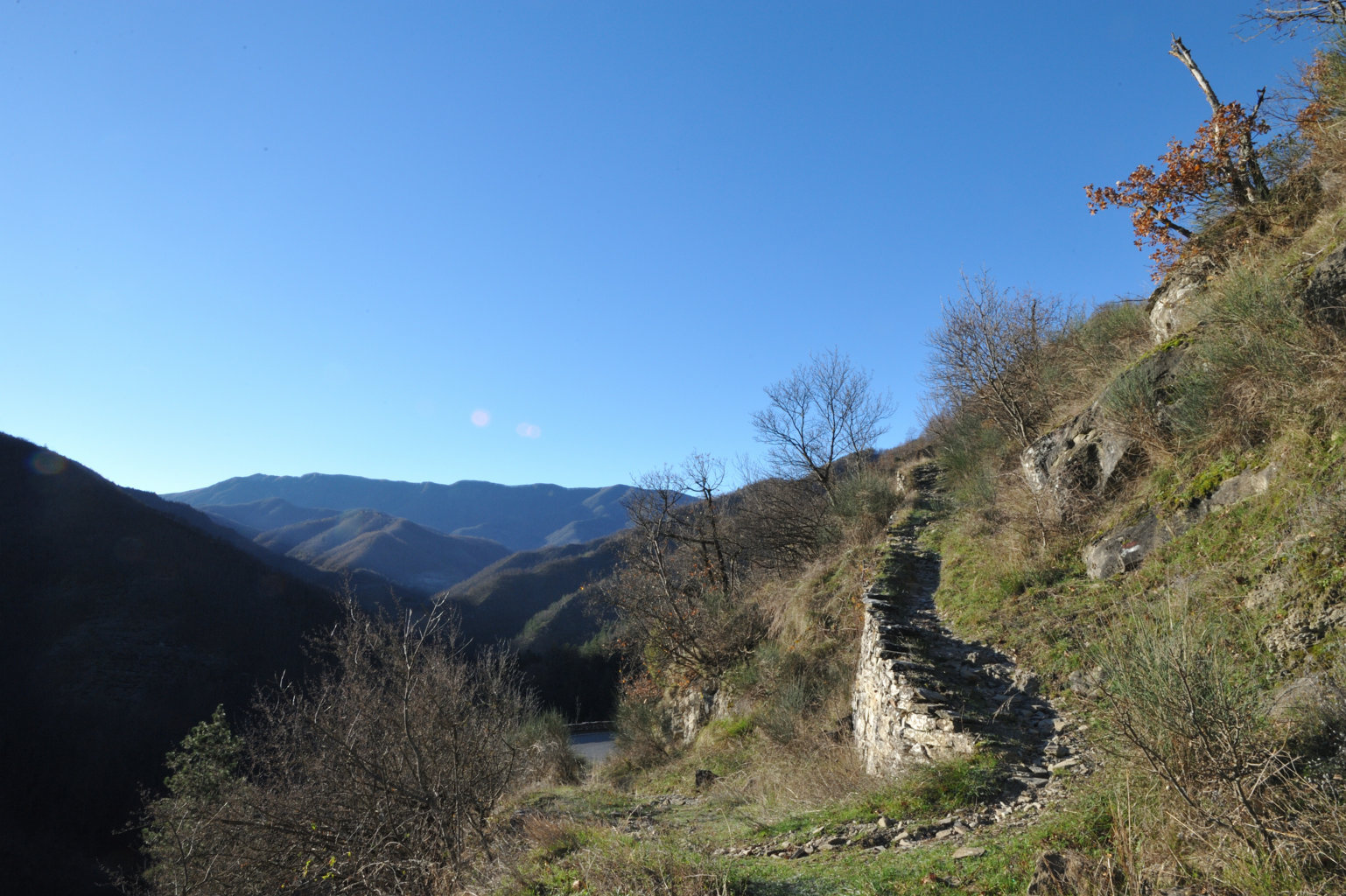 00i1/00i4 – Dalla SP 4, a circa 200 m dal ponte di Lago e dalla successiva piazzola con pannello turistico, si notano resti di terrazzamenti che, per corrispondenza con il catasto ottocentesco, sono da ritenere di sostegno dell’antica Via Romagnola, riconoscibile per il pietrame di contenimento della massicciata (29/12/18).