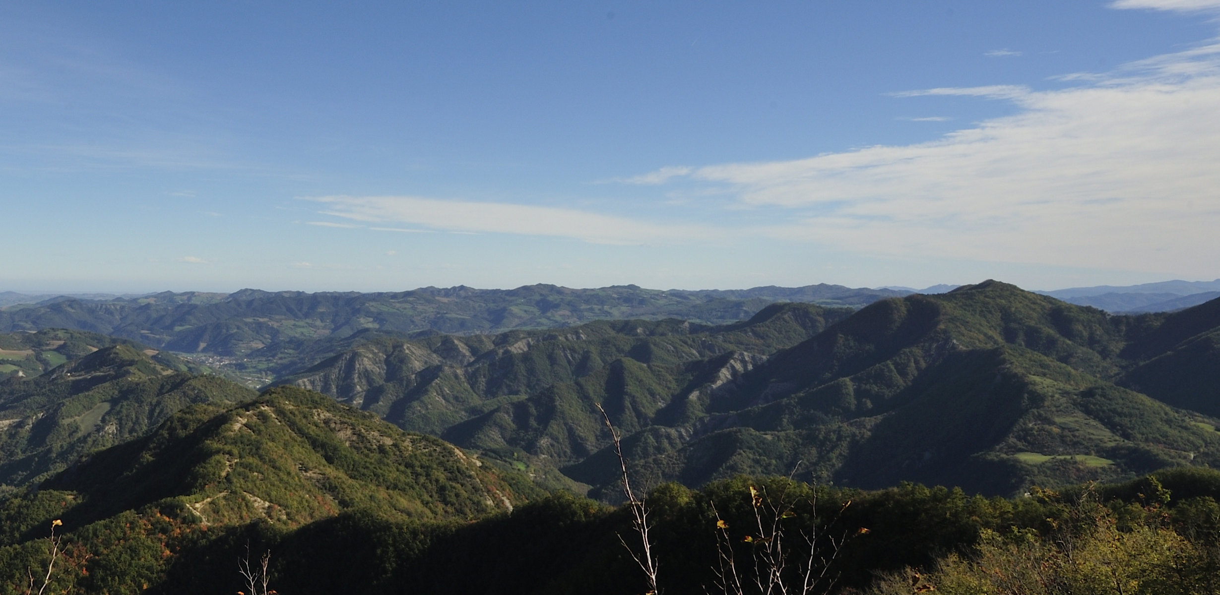 00a1 – 00a2 - 00a3 – Dal Canale del Pentolino, sulla Giogana presso Poggio Scali, panoramica settentrionale fino all’Adriatico mentre oltre il Crinale della Vacca si nota la parte terminale della Valle di Ridracoli da Biserno fino a Isola (e Santa Sofia), con scorcio della sequenza di dorsali trasversali in dx idrografica paesaggisticamente rilevanti per gli estesi affioramenti della Formazione Marnoso Arenacea (10/11/14 – 16/08/16).