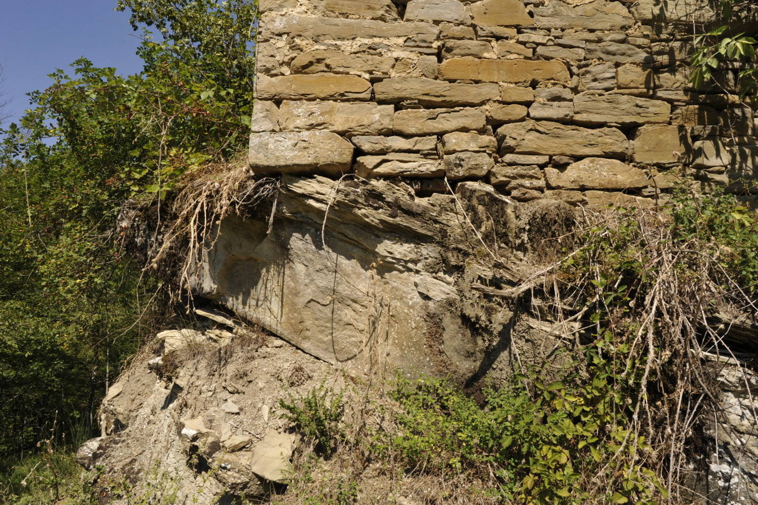 00g1/00g6 – Mentre la via antica giungeva da SE, fermandosi al fabbricato (foto 1), la strada moderna, giungente da NO, ne ha perfino eroso la parte antistante, rendendo inaccessibile la stalla ed evidenziando lo sbalzo roccioso sul cui bordo poggia il fabbricato (6/08/18 - 13/08/18).