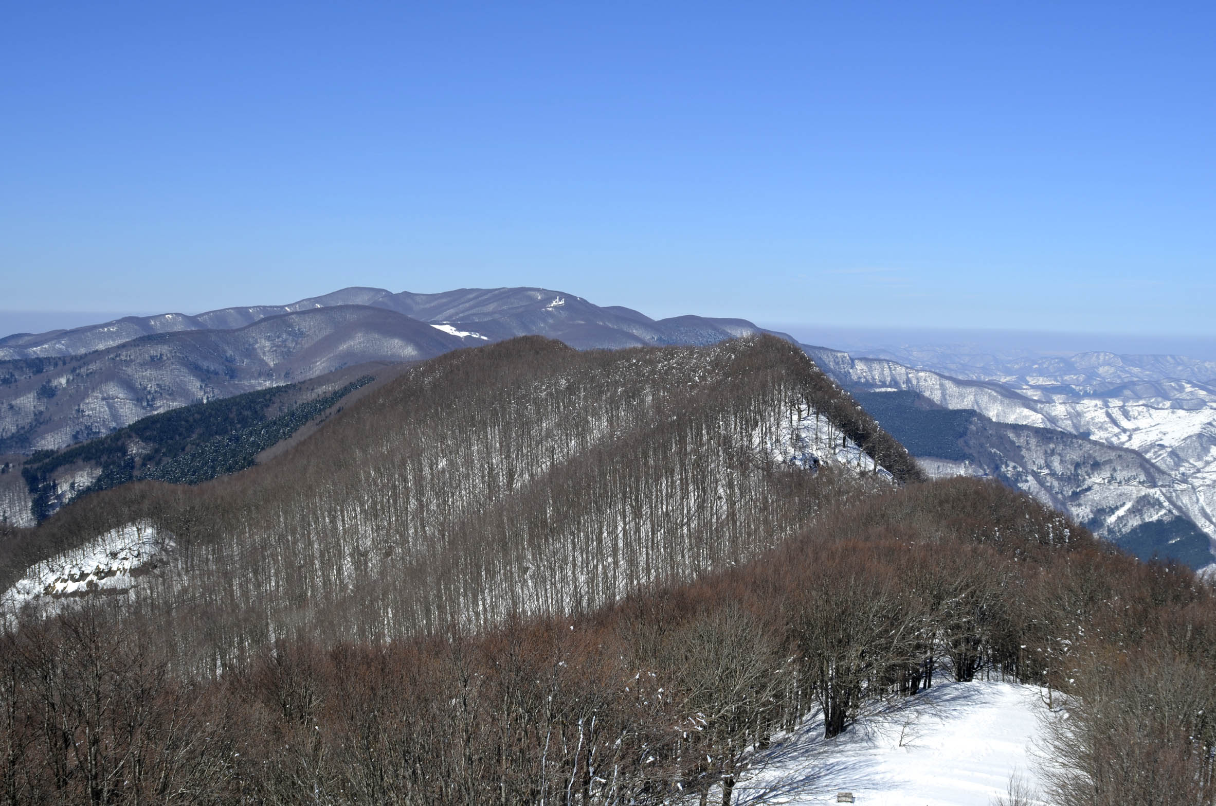001a– 001b – Dal Monte Piano (vetta del contrafforte principale che si distacca da Cima del Termine) si può avere una delle più ampie viste dell’intero spartiacque appenninico che si innalza oltre il contrafforte secondario che separa le Valli del Bidente di Pietrapazza (in p.p.) e di Ridràcoli. Nel suo sviluppo è abbastanza agevole riconoscere sia le due vette maggiori dei Monti Falterona e Falco sia il Monte Gabrendo accanto al quale spicca la copertura nevosa dei prati della Burraia (01/01/12).