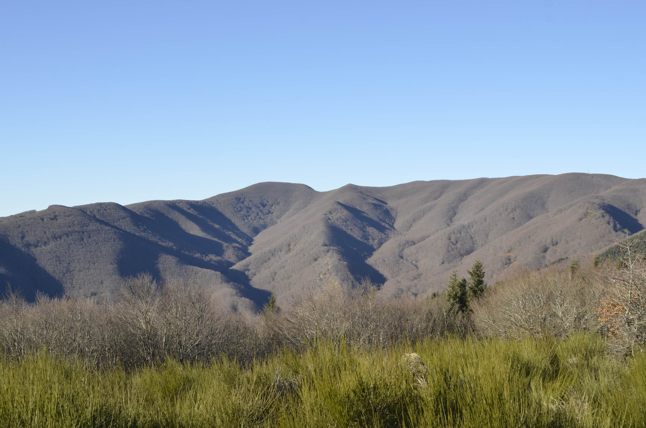 003a – 003b – Spostandosi sul versante appenninico casentinese, dai pressi del passo del Giogarello sul crinale che si distacca dal Monte Gabrendo verso Sud (sent. 82 CAI), si ha una panoramica inconsueta del complesso del Falterona con la lunga dorsale del Falco interrotta dal “becco del rapace”. Lontanissime si scorgono le Alpi Apuane (11/01/12).
