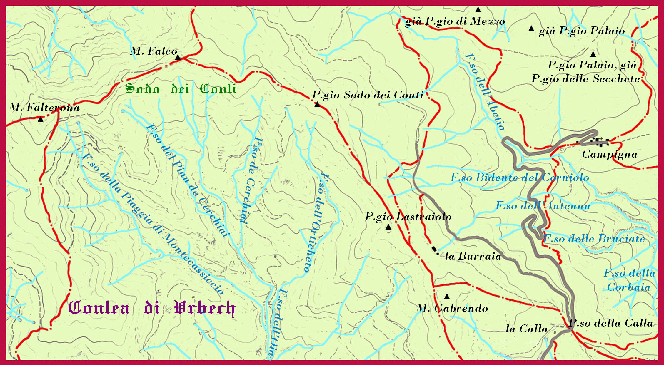 Nelle citazioni sopra riportate o altri atti pubblici conservati nell’Archivio dell’Opera del Duomo di Firenze contenenti descrizioni dei luoghi il Monte Falco non viene mai richiamato mentre compare spesso “la Falterona”. Così avviene nella descrizione di Emanuele Repetti: «Da quella sommità della Falterona fra il Poggio Mocali, Prato al Soglio e il poggio a Scali, sul giogo onde a Camaldoli si viene […]» (E. Repetti, Dizionario geografico fisico e storico della Toscana, 1881-1883). Carlo Beni nella prima edizione della sua Guida pare non averne contezza: «[…] quantunque la Falterona non sia un monte altissimo, tuttavia la sua posizione centrale gli apre dintorno un orizzonte e panorama vastissimi. […] (2) […]. La veduta abbraccia gran parte dell’Italia centrale avente per confine il Mare Adriatico, e il Mediterraneo, che da lontano appariscono come due grandi strisce d’argento. Le città della Romagna fino alla costa Adriatica, quelle di Arezzo e Firenze coi loro monumenti si distinguono perfettamente. Più lunge s’ergono il Monte Amiata, il Cimone, le Montagne di S. Pellegrino, l’Alpi Apuane […]. Discesa a levante la piramide della Falterona per un forte pendio, si trova subito la via del Sodone, che è la prosecuzione di quella di Montelleri, e che passato il Valloncino, porta a un bel prato coperto di finissima erba, chiamato il Sodo de’ Conti, ove comincia il possesso ex-granducale della Casa di Lorena. Questa foresta è ricca di selvaggina, e specialmente di cervi, che chiusi un tempo, e riacquistata poi la naturale libertà, si sono straordinariamente moltiplicati, tornando ad essere oggetto di lecita caccia.» (1881, pp. 54-55, cit.), ma la seconda edizione contiene una specifica integrazione al periodo citato: «Dal vertice triangolare della Falterona si scende verso levante per un forte pendio di fronte al quale s’erge un altro monte chiamato Monte-Falco, che gareggia in altezza colla Falterona.» (1889, p. 188, cit.). Probabilmente la formazione del toponimo nel XIX secolo non si era ancora sedimentata del tutto e solo l’inizio del turismo invernale portò a rievocare quel caratteristico profilo associato alle forme e alle frequentazioni del noto rapace frequentatore di un habitat favorevole alle sue necessità predatorie. Il toponimo M. Falco pare infatti che compaia per la prima volta nella Carta topografica d’Italia I.G.M. di primo impianto in scala 1:100.000 (per l’Emilia-Romagna rilevata negli anni 1877-95), mentre nella Carta storica regionale o Carta Topografica Austriaca del 1853, in scala 1:86.400, i toponimi montani dell’area sono limitati ai seguenti, così trascritti: M. Falterona, P.o Martino, Pog.o Palaio, Gabrendo. Solo il Falterona è riportato anche nella settecentesca PIANTA DELLA CONTEA D’VRBECH (da alcuni ritenuta riguardante la riconfinazione granducale del 1563, che conciliava le circostanti realtà comunali con la superstite enclave feudale), conservata presso l’Archivio di Stato di Firenze (M. Massaini, 2015, cit.), dove tra l'altro sono rappresentate le aree del Falco interessate dagli Abeti di S. M. Nuova e dagli Abeti di S. Maria del Fiore. Gli antichi possedimenti dell’Opera del Duomo di Firenze si estendevano infatti da Poggio Corsoio a Cima del Termine, confinando (con dispute) ad Ovest con i possedimenti dello Spedale di S. Maria Nuova di Firenze e ad Est con quelli del Monastero di Camaldoli. Sul versante toscano di Poggio Sodo dei Conti, fino al Monte Falco, si estendeva fino la crinale la Contea di Urbech in base ai confini stabiliti nel 1561 da Cosimo I de’ Medici, che intendeva «[…] togliere ogni giurisdizione dei conti d’Urbech su Stia […] residuo di vecchi e arcaici diritti medievali […] “per motivi di ordine pubblico”.» (M. Massaini, 2015, p. 100, cit.). Dall’atto stilato dal cancelliere si rileva che per la ridefinizione dei confini fu necessario ispezionare l’intero tracciato posizionando appositi segnali, spesso consistenti in cippi lapidei detti “termini”. Il tratto di confine orientale diretto al crinale seguiva «[…] il fiumicino che passa sotto la chiesa di Monte Mezzano. […] La delimitazione della contea, seguendo il torrente citato, arrivava fino al crinale dell’Appennino. Il punto esatto fu evidenziato da due segni di croce su un grosso faggio, che si trovava a 350 braccia dalla sommità, quindi, da questo […] la demarcazione andava dritta al crinale (quinto termine). Seguendo il crinale a sinistra, verso l’attuale Passo della Calla, la delimitazione proseguiva «[…] fino “… ai termini e chonfini che sono fra li omini di Porciano e li Chonti d’Orbeco da una, e li omini di Rincine e Fornace dall’altra …”. Qui ci sarà il sesto termine.» (M. Massaini, 2015, pp. 100-101, cit.). I corsi d’acqua citati paiono corrispondere al Fosso di Monte Mezzano e al suo confluente Borro delle Fogne, che risale verso lo Spartiacque presso il Poggione, dove comprensibilmente non si rintracciano cippi risalenti a cinque secoli addietro. A seguito di numerosi ricorsi, nel 1563 viene annullato l’atto del 1561 ridimensionando notevolmente il territorio della contea e tra l’altro si ristabilisce il confine da Montelleri al crinale presso il Falterona, che da qui seguiva la «[…] “… via della Cavata, overo Bordonaia e continuando per la detta via su la giogana per spazio di un terzo di miglio, o più o meno, infino alla dirittura del fossato dove comincia el fiume della Loia …”.» (M. Massaini, 2015, p. 104, cit.). Questo punto del crinale è facilmente individuabile nel sito di Sodo dei Conti, nei pressi della stazione radio militare, dove nasce il Fosso di Mandria d’Orso cui segue il Fosso dell’Orticheto, ramo del Torrente Oia che costituisce quindi confine orientale della contea, dove Ducci e Maggi nella loro opera (p. 29, cit.) hanno individuato un cippo con incisione FC (Foresta Casentinese) le cui caratteristiche fanno presumere un