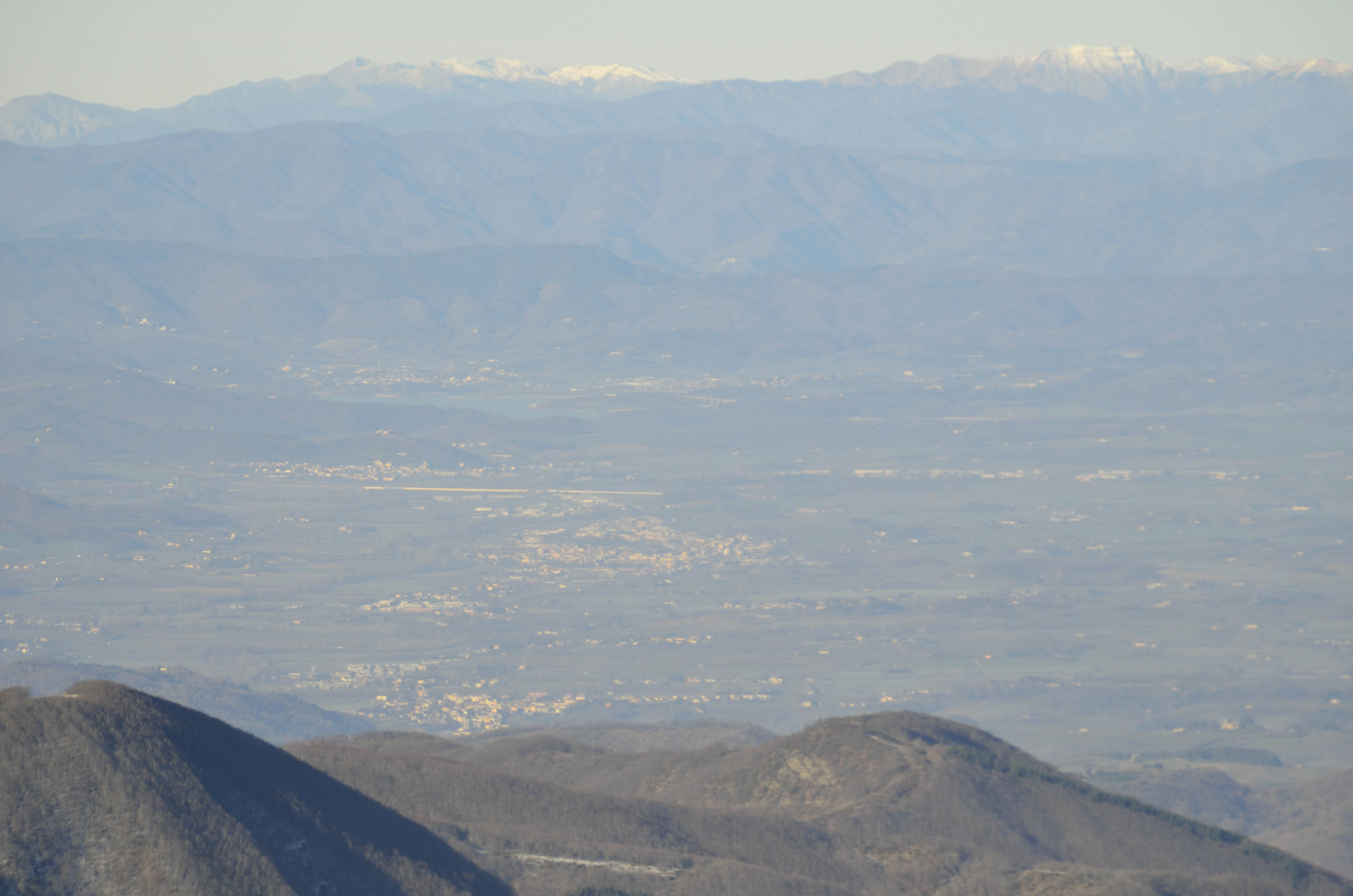 004f - 004g – Sulla vetta del M. Falco si trova un comodo belvedere da cui si apre un ampio panorama che spazia dalla sottostante Valle di Castagno (si riconoscono Castagno d’Andrea e S. Godenzo) all’amplissimo bacino del Mugello, apparentemente coronato dalle lontanissime Alpi Apuane (27/09/11 - 21/12/11).