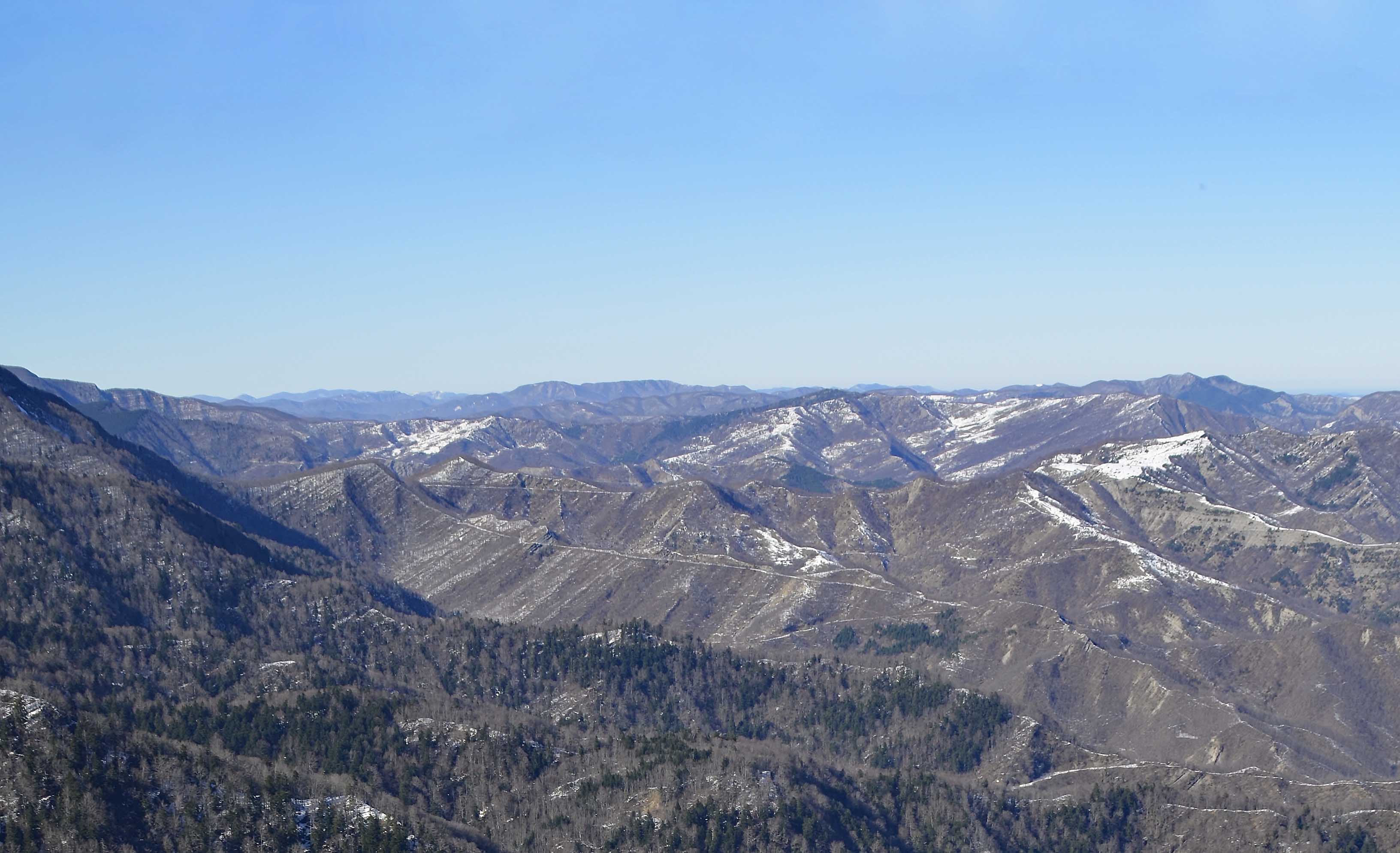 001a/001e – Dal Monte Penna, oltre la vallata del Bidente di Ridràcoli, si nota l’intero profilo del tratto iniziale del contrafforte secondario che si stacca da Poggio Scali dove si evidenzia la sella di Pian del Pero interrotta dal Poggio della Serra, affiancato da Poggio Capannina (7/02/11 – 13/01/16).