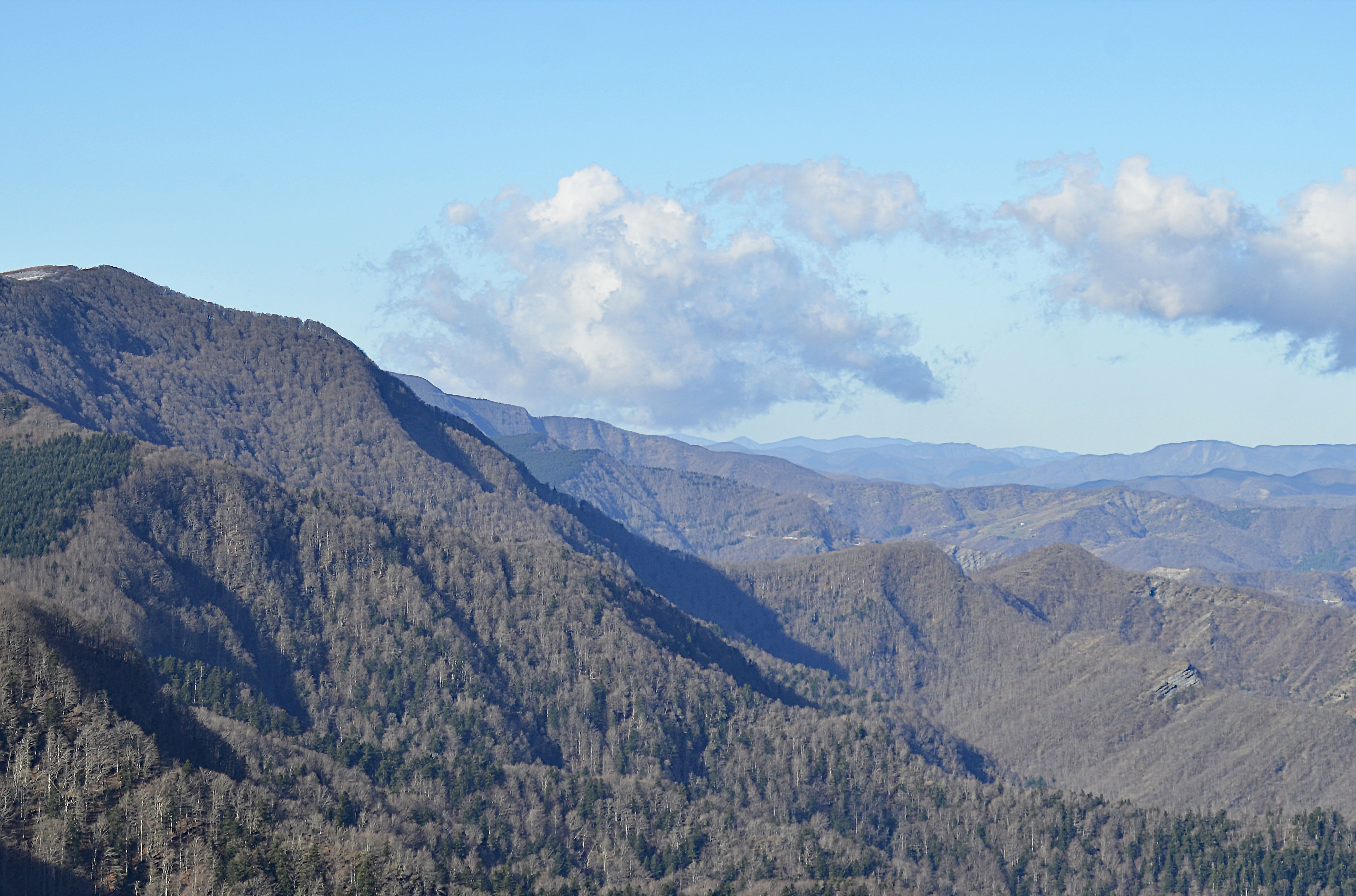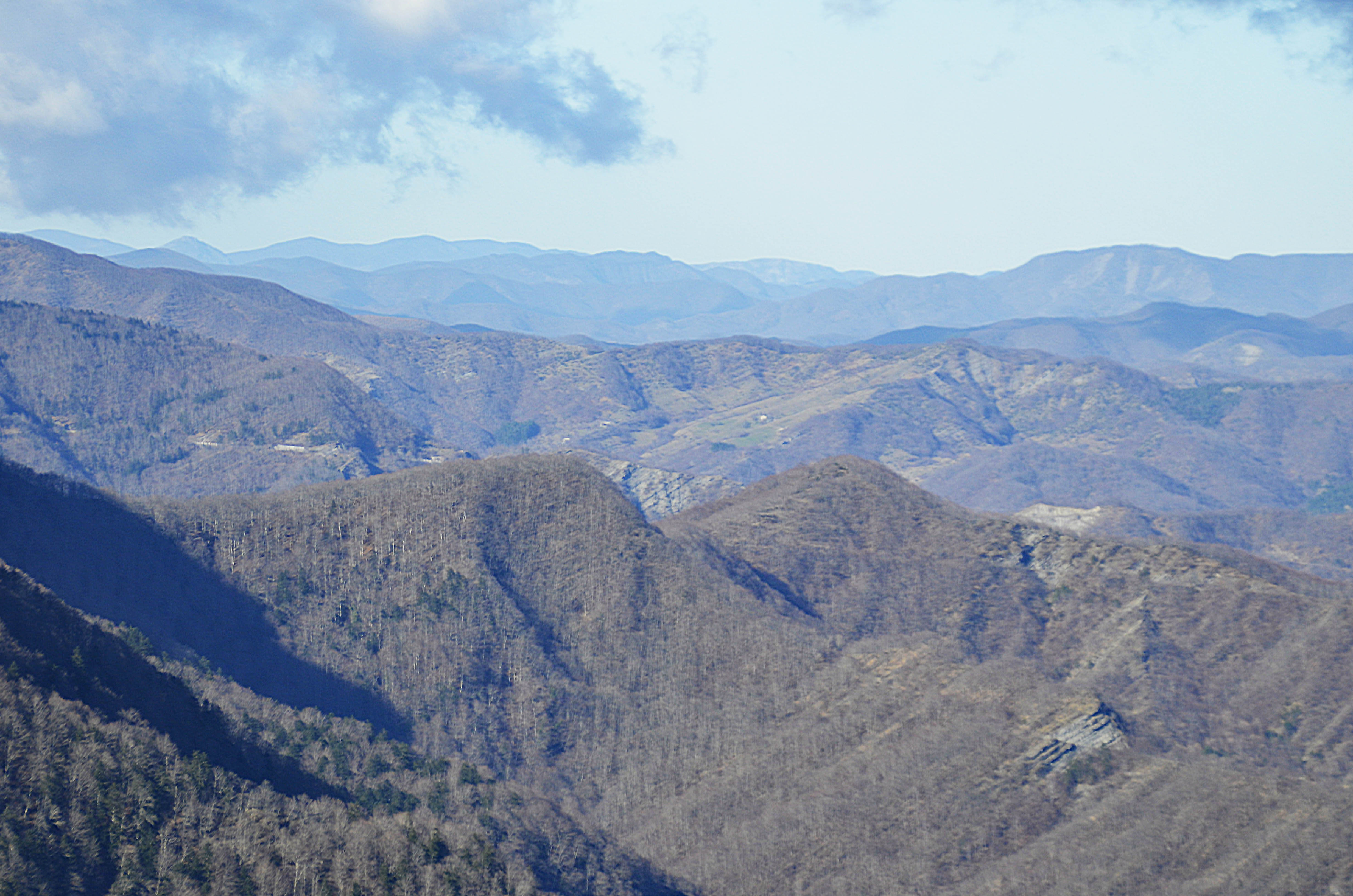 004i – 004l – 004m - Dal crinale tra i Poggi Capannina e Ricopri si aprono viste panoramiche, da un lato verso lo spartiacque tosco-romagnolo ed il complesso M.Gabrendo-M.Falco, dall’altro lato verso l’Altopiano di S. Paolo in Alpe e le spettacolari stratificazioni incise dall’antica mulattiera, oggi ripido sentiero 255 (16/11/16).