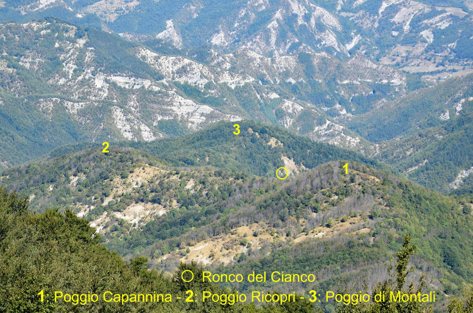 003fa – Dalla vetta di Poggio di Montali, un ridotto scorcio tra la vegetazione si apre dirimpetto ai Poggi Capannina e Ricopri (20/05/18).