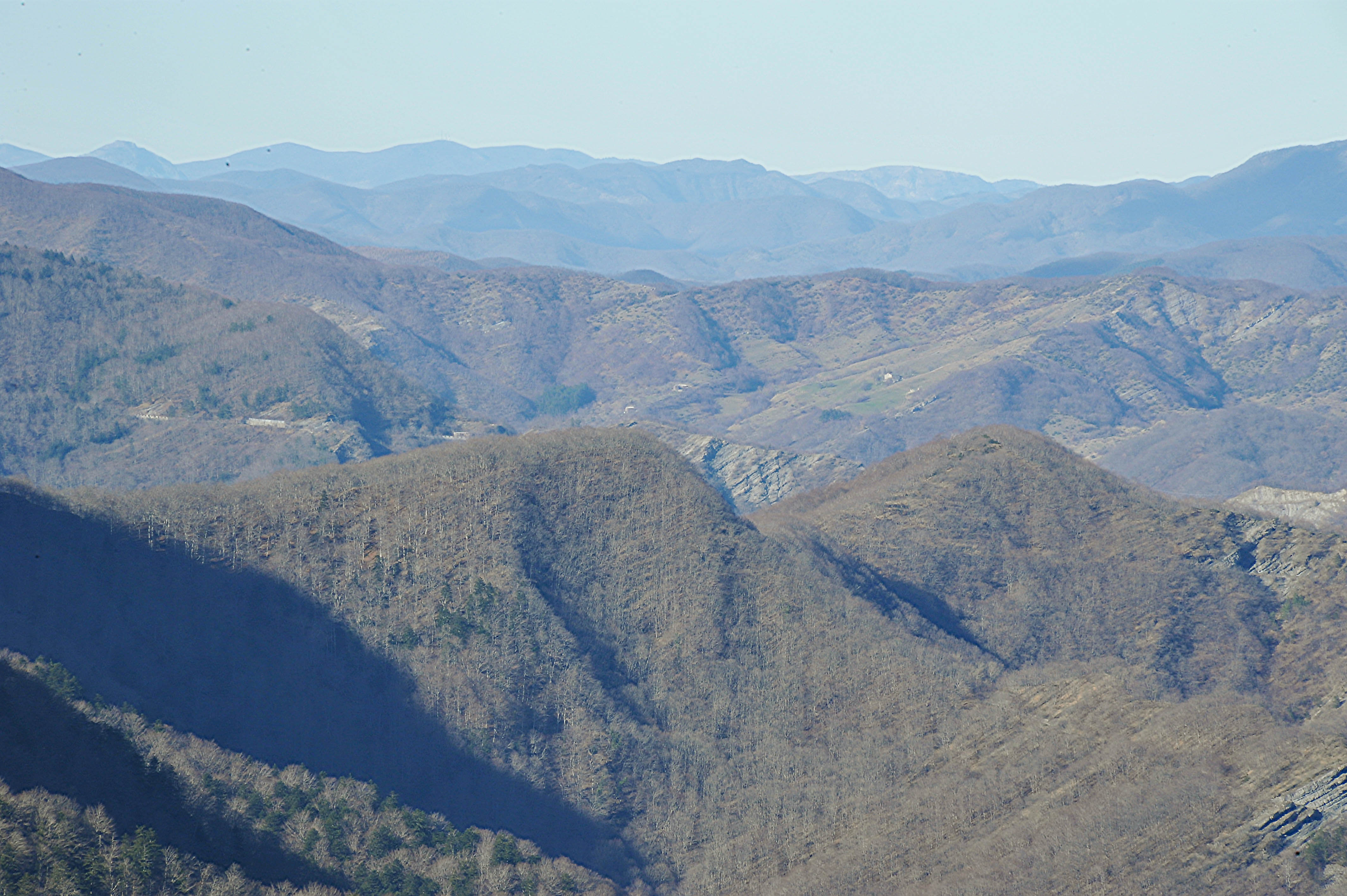 002l – 002m - Da Tre Faggi, all’inizio del Crinale del Corniolino, altra vista da occidente dello stesso tratto di dorsale di cui in precedenza, dove le ombre pomeridiane evidenziano la morfologia (30/11/16).