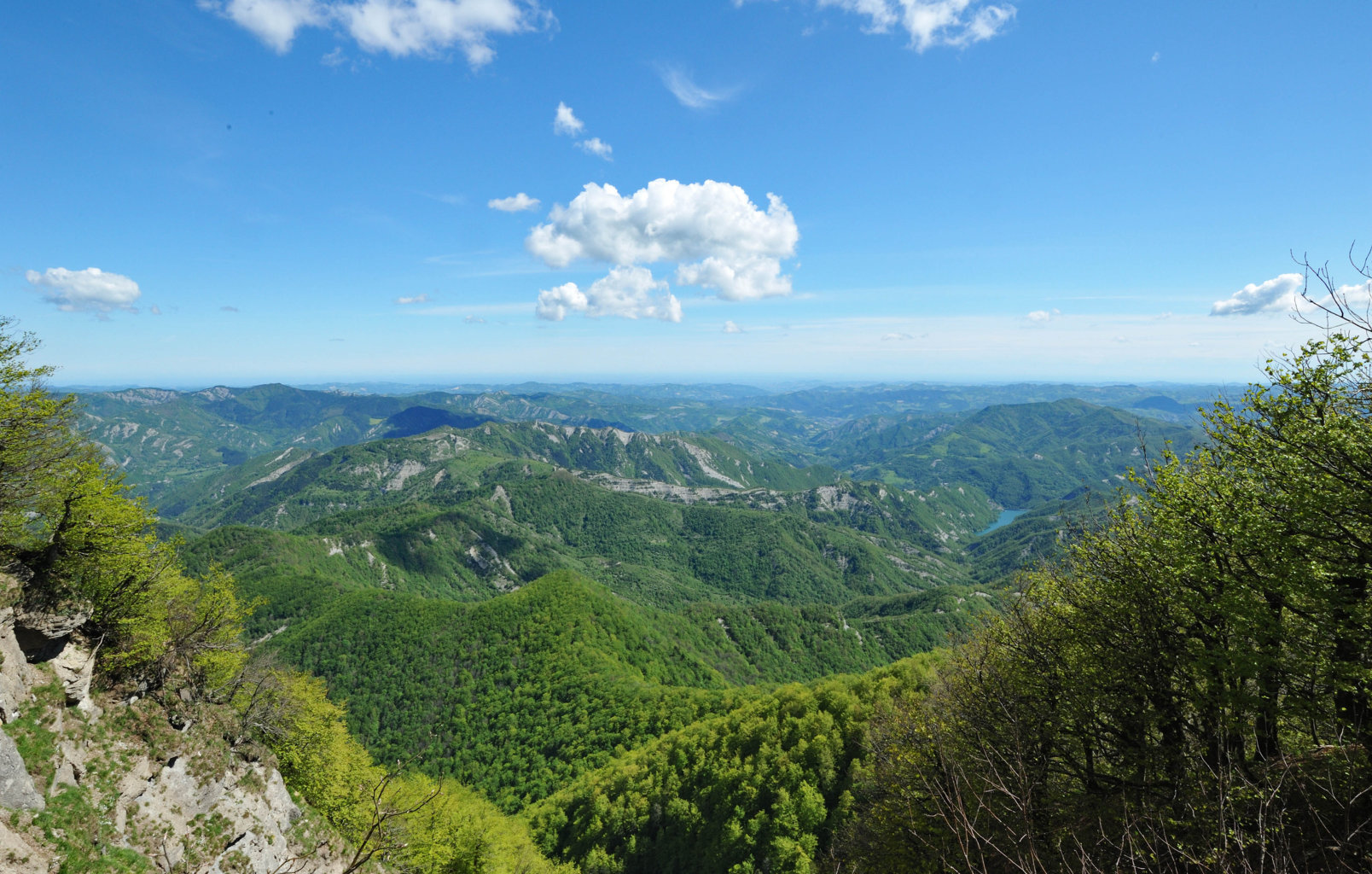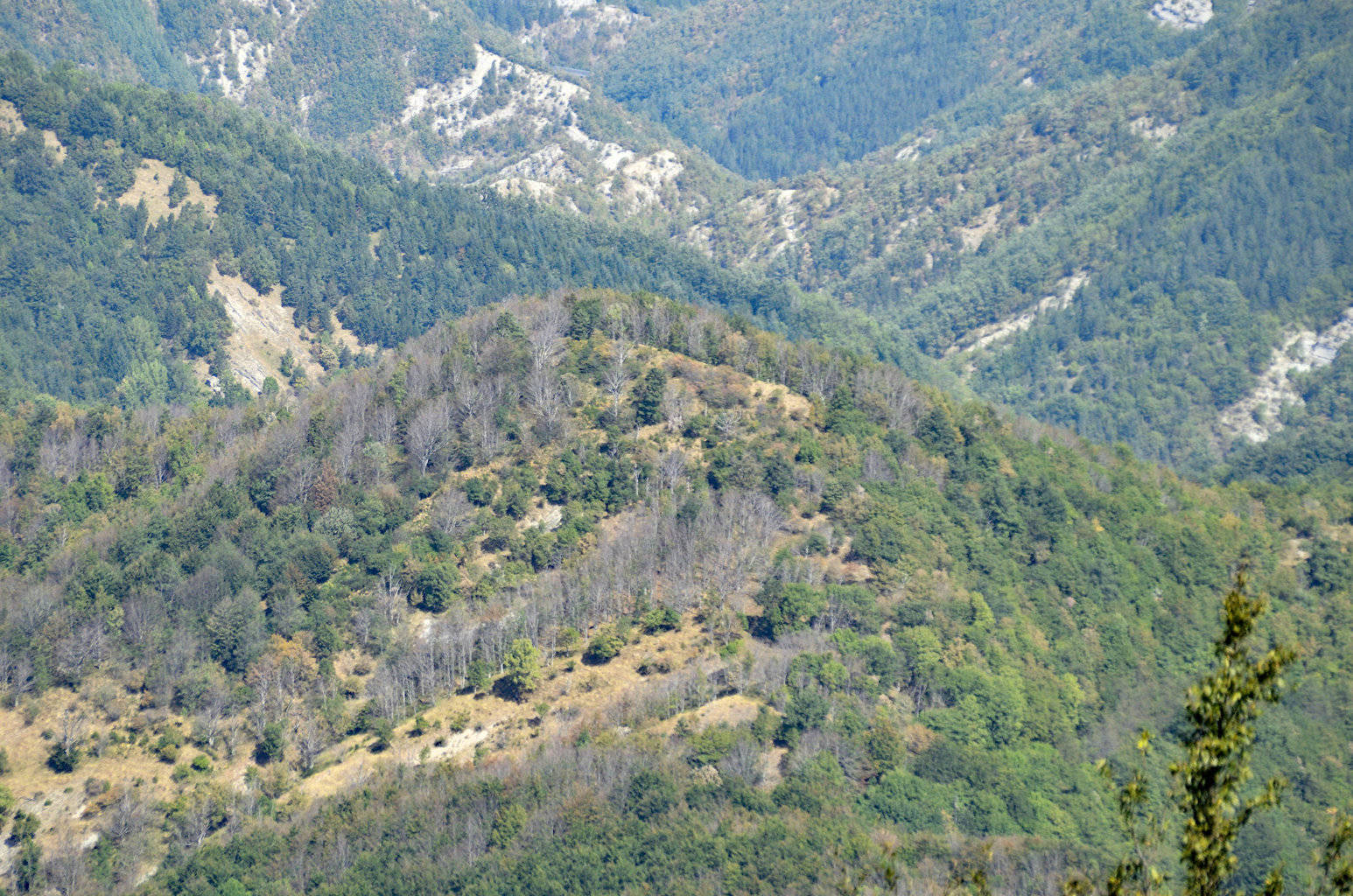 004eg/004em – Verso occidente lo scorcio panoramico spazia dall’Altopiano di S. Paolo in Alpe, con il terrazzo morfologico di Campodonato, la dorsale di appartenenza con i Poggi Ricopri e di Montali, e lo spartiacque appenninico, con le sue ripe, La Porta e di Pian Tombesi, il Poggione, e le Coste che penetrano nella Valle di Campigna: Le Cullacce, di Poggio del Ballatoio e di Poggio Termini (2/06/18).