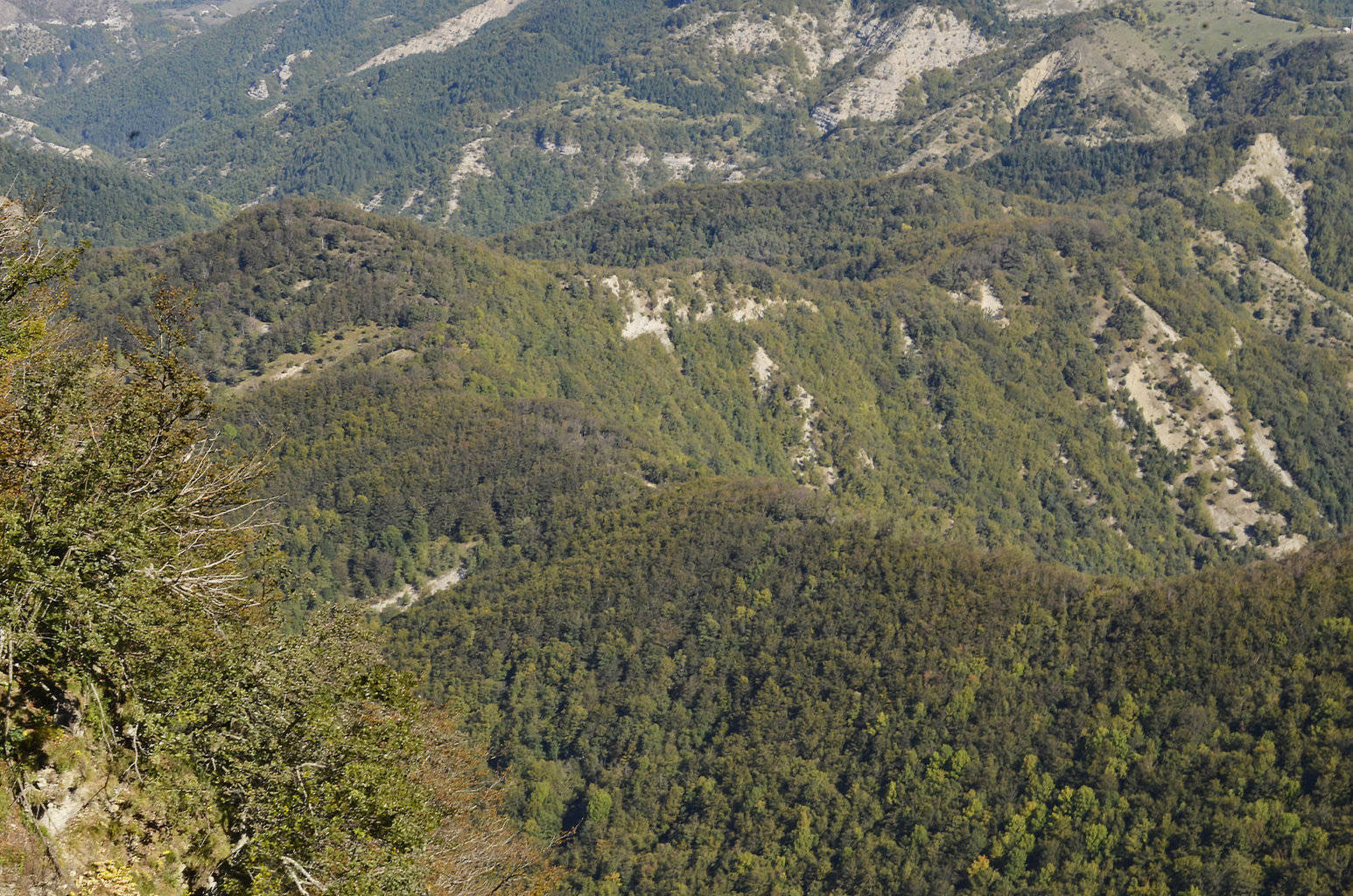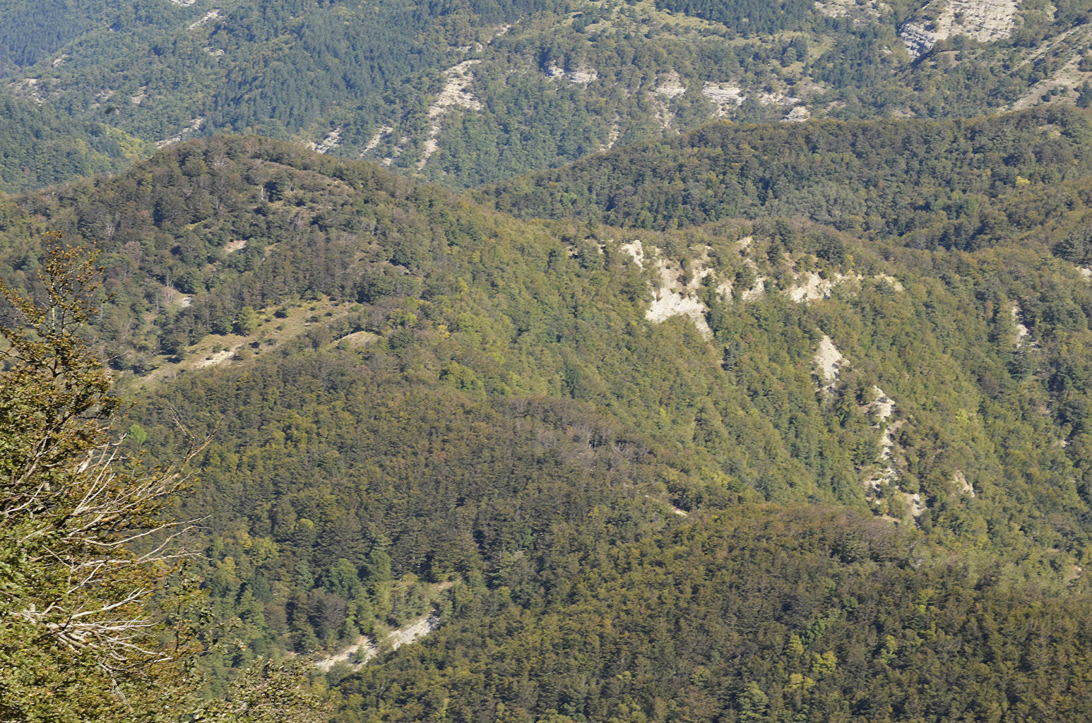 002n – 002o – 002p - Dal Sentiero degli Alpini (SA 301 CAI), sul contrafforte principale dai pressi del M. dell’Avòrgnolo, anche le giornate più nuvolose consentono di avere una vista dall’alto dei rilievi che delimitano l’ultimo tratto del Bidente di Campigna; oltre il Crinale del Corniolino si nota bene anche la parte del fondovalle dove l’arcuata dorsale distaccatasi da Poggio Capannina separa il Fosso Fiumicino di S. Paolo mentre converge sul Bidente, segnata dalla rotabile che risale verso S. Paolo in Alpe, particolarmente evidente in assenza di interventi di mitigazione paesaggistica nel tratto tra Case Fiumari e Moscoso, quest’ultimo nascosto appena dietro il crinale (23/11/16).