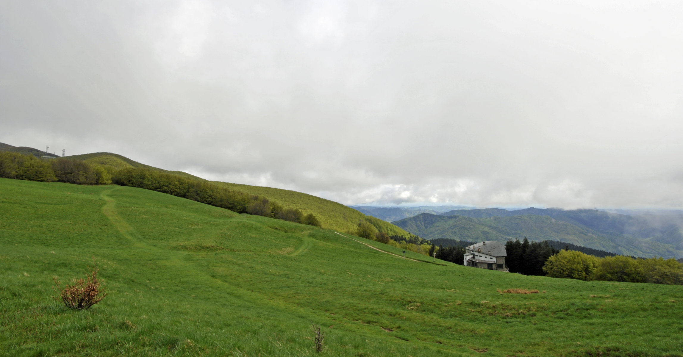 00d1 – 00d2 - Dal contrafforte principale percorso dal Sentiero degli Alpini (SA 301 CAI) si riesce a seguire l’intero skyline Monte Falco-Poggio Sodo dei Conti-Poggio Lastraiolo-Monte Gabrendo ed a traguardare i prati della Burraia con il Rifugio Cai Città di Forlì (16/04/16).
