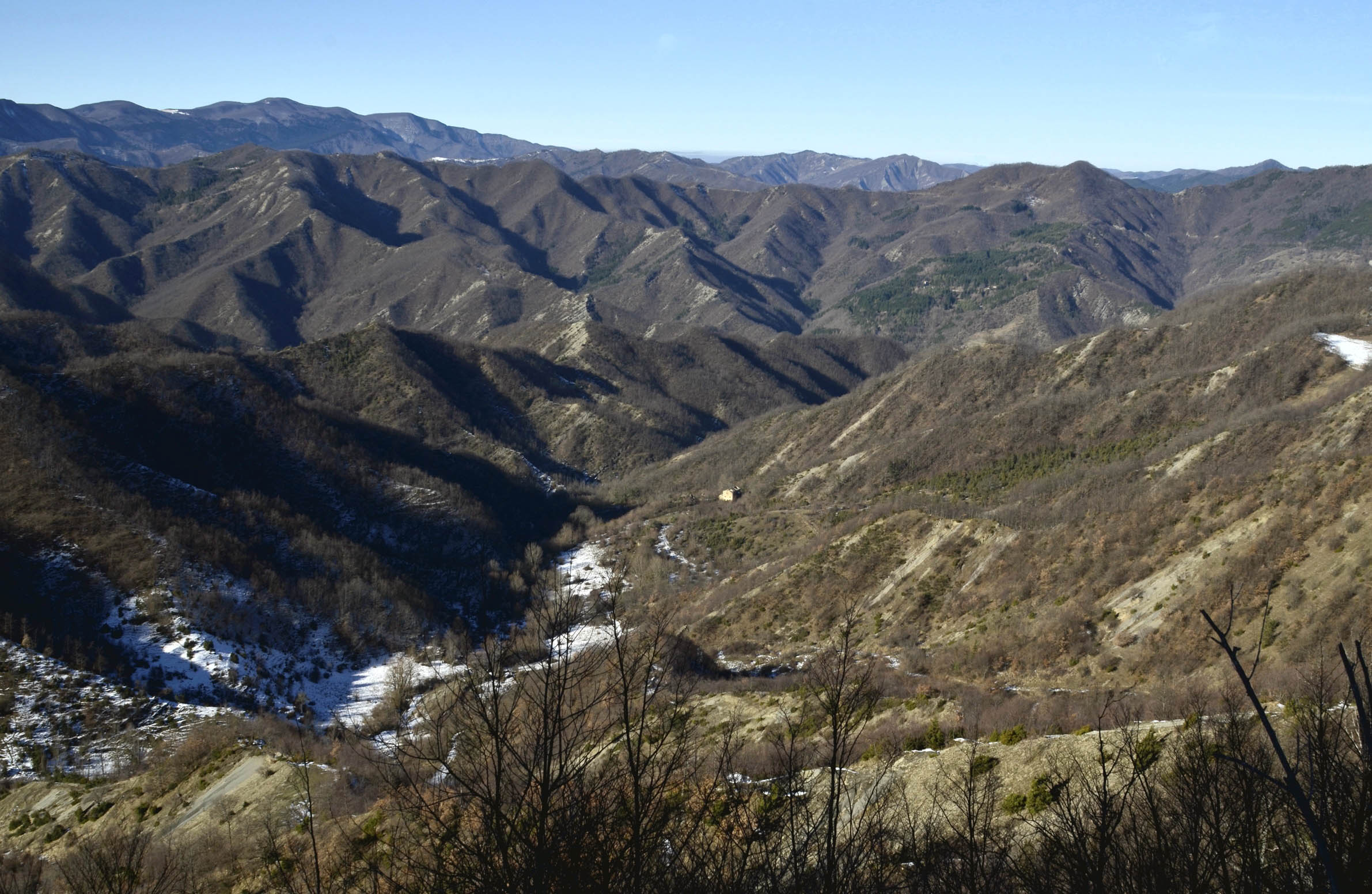 003e – 003f – 003g - Dal Monte Piano e dalla sella del contrafforte alla testata del Rio Salso si nota l’ultimo tratto della dorsale che congiunge il Monte Castelluccio al Monte Casaccia (al centro delle foto) e poi digrada verso il fondovalle del Bidente, così costituendo elemento geomorfologico che consente di collocare una separazione tra le valli di Pietrapazza e di Strabatenza. Il fabbricato è Valcitura (1/01/12).