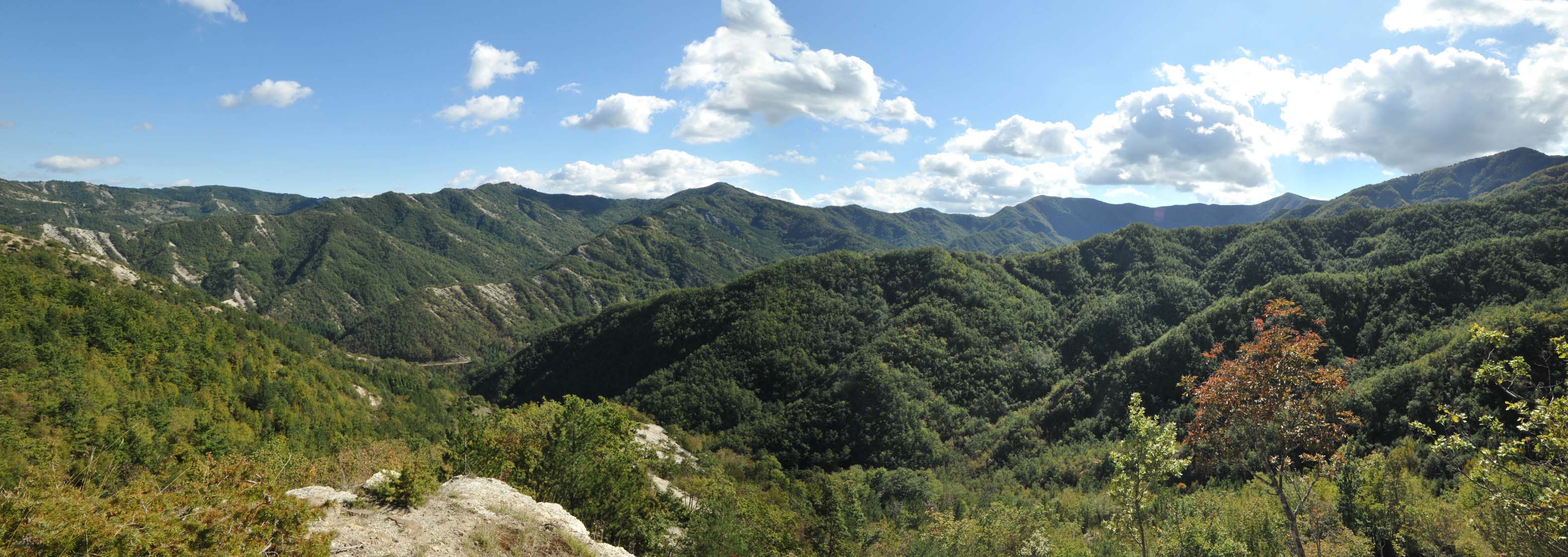 004d – Tra la fitta vegetazione arborea di Cima del Termine si apre uno scorcio sulla Valle di Pietrapazza ed oltre, coronata dalla parte terminale del contrafforte secondario con i Monti Marino e Pezzoli fino a Poggio Busca, che precede e nasconde il Carnovaletto. In 1° p. sulla dx tra i rami si scorge uno dei liscioni nudi del Monte Càrpano che guida lo sguardo sul sito di Pietrapazza; più oltre l’effetto prospettico deforma il crinale con i Monti Casaccia e Riccio che delimita lo sbocco della valle a Pian del Ponte (al centro della foto) (3/10/11).
