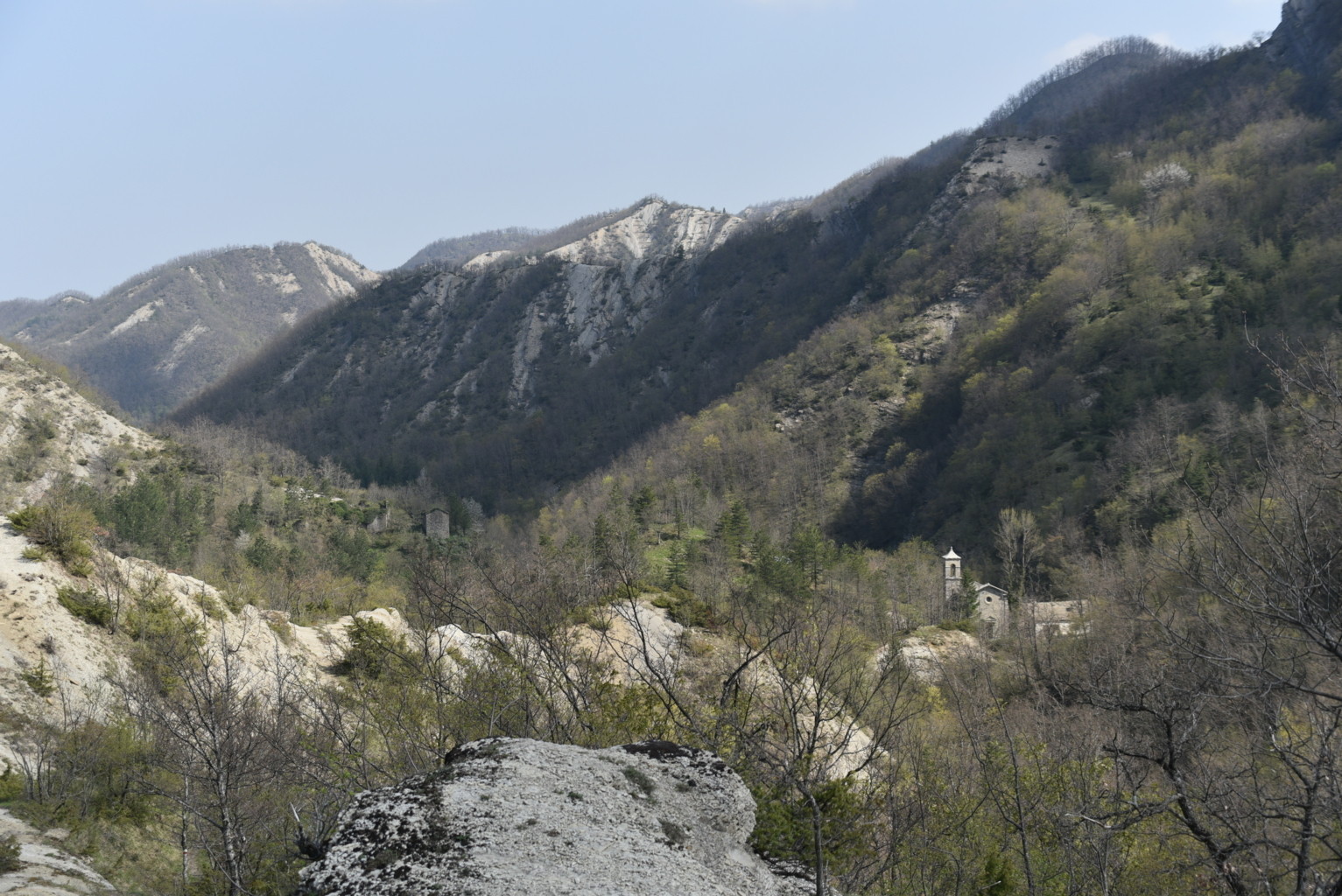 004e – Un altro scorcio verso Nord si apre tra la vegetazione del citato Raggio del Finocchio che consente di notare la sezione a “V” della Valle del Bidente poco oltre Pietrapazza con gli insediamenti di Cà dei Conti e Cà di Pasquino (1/09/16).