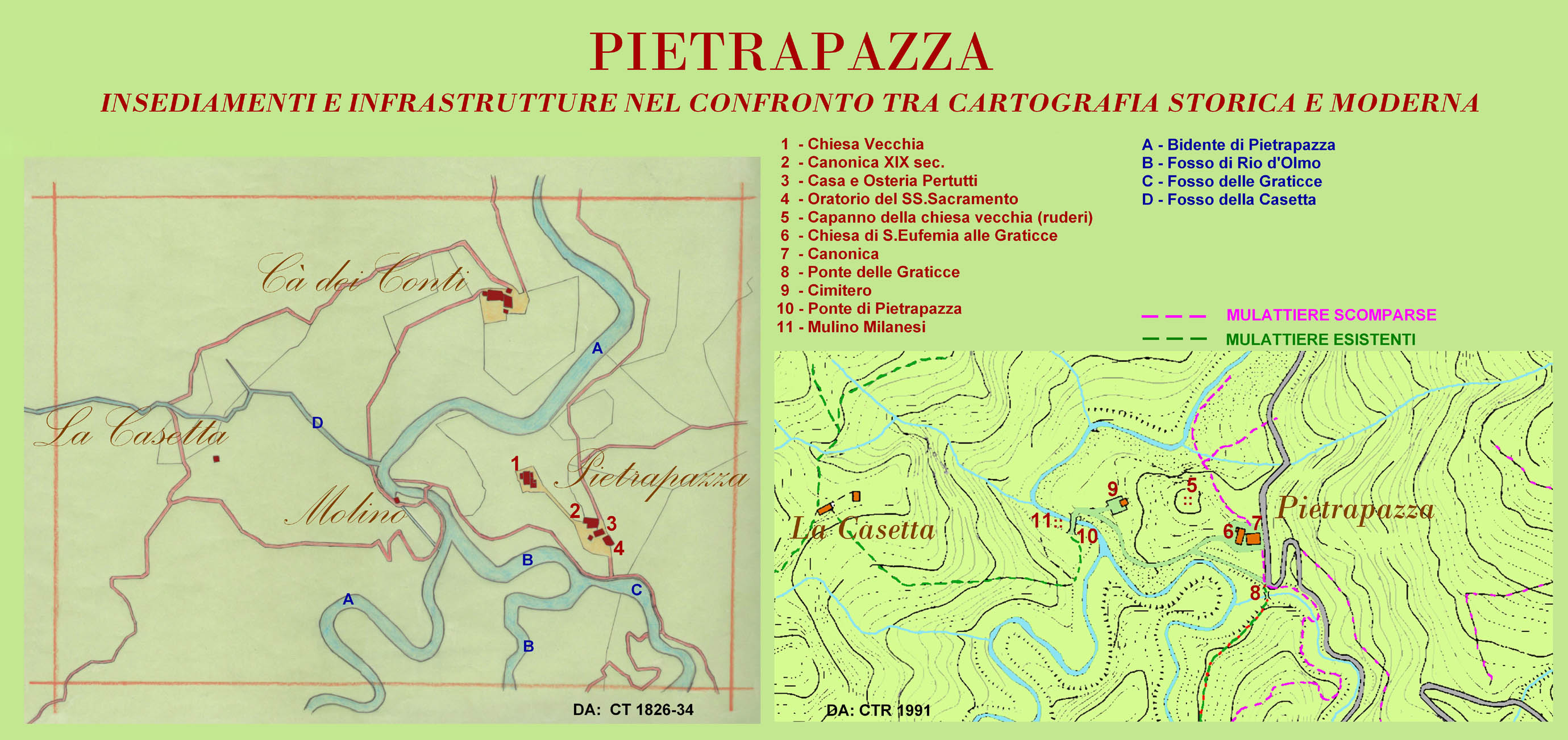 - Pietrapazza: «1595 – Mons. Peruzzi l’8 agosto […] andò alla chiesa di S. Eufemia delle Graticce, detta di Prete pazzo (Pietrapazza).» (D. Mambrini, 1935 – XIII, p. 299, cit.).«La muntâgna la è bëla da vdē. […] La montagna è bella solo a vedersi, detta un proverbio romagnolo […], mentre è brutta per chi la vive e chi la pratica, testimoniano tanti toponimi peggiorativi […] Brutta perché è povera […] Tanto povera da tenere lontani perfino i ministri della Chiesa, come narra la storia del toponimo Pietrapazza […] derivato da Prete Pazzo […]» (E. Casali, 2001, p. 405, cit.). Ma anche «[…] come l’ital. strapazzo e pazzo < [= deriva da, ndr] lat. patiens, (anche, sterile, aspra non buona).» (A. Polloni, 1966-2004, p. 235, cit.).