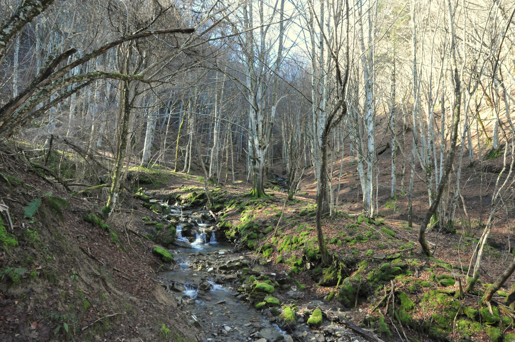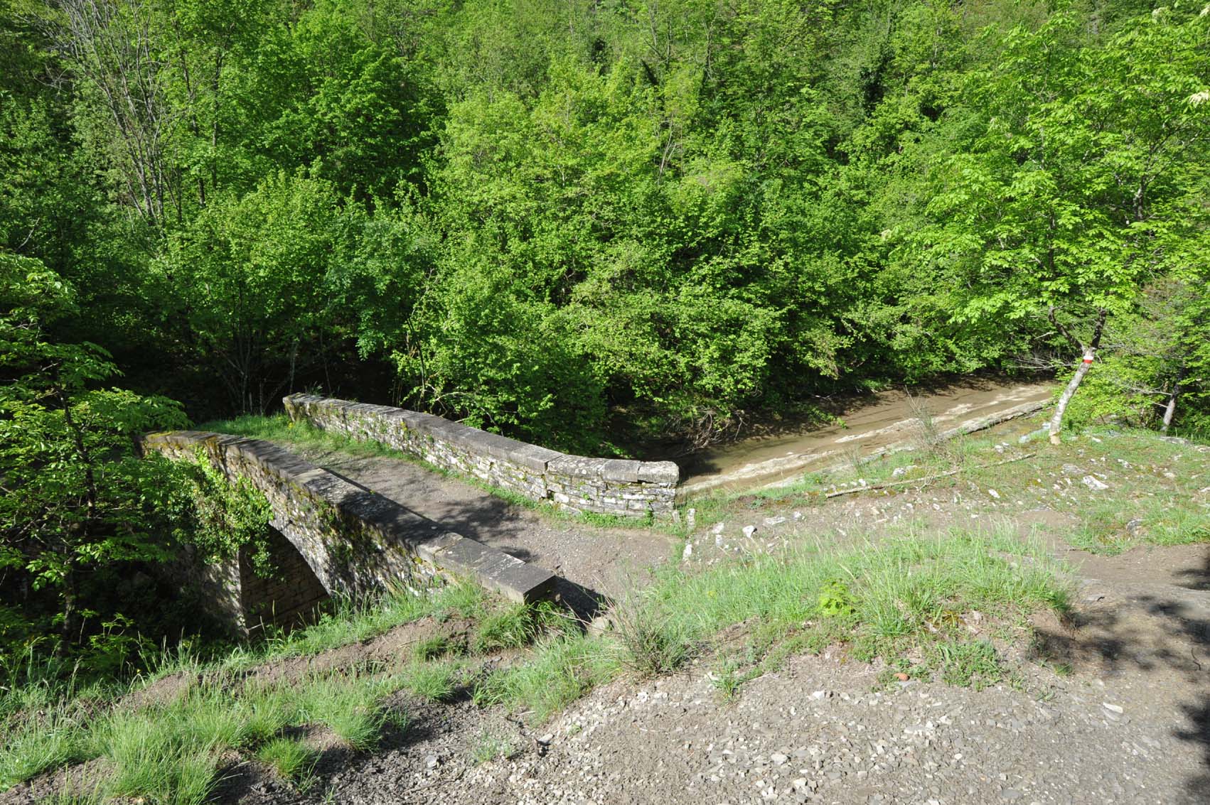 018g/018m – Un’evidente traccia in pochi minuti scende verso il Bidente ma non è il caso di attraversarlo sul Ponte dell’Eremo, infatti delle tre travi affiancate che probabilmente lo componevano apparentemente ne resiste ancora una, mentre non mostrano particolare usura le forti spalle in pietra. Volendo proseguire verso Prato ai Grilli, al guado si può trovare forte afflusso idrico (19/02/17).