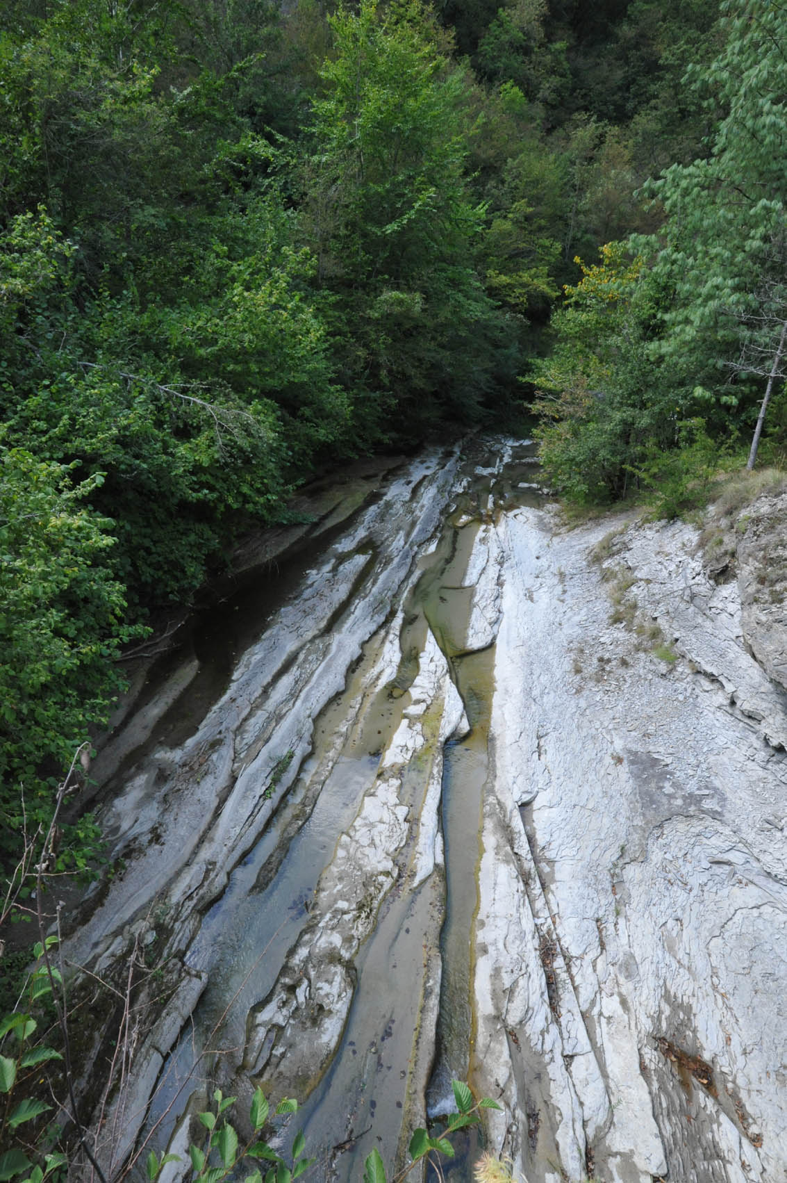 013a/013e – Il piazzale con il sagrato antistante il nucleo di Pietrapazza si affaccia sull’ansa quasi circolare del Rio d’Olmo, dove si è appena aggiunto il Graticce, che mostra profondi e contorti meandri dovuti all’azione erosiva esercitata dalle confluenze torrentizie concentrate in un’area limitata su stratificazioni marnoso-arenacee di varia giacenza (18/10/11 - 12/08/16).