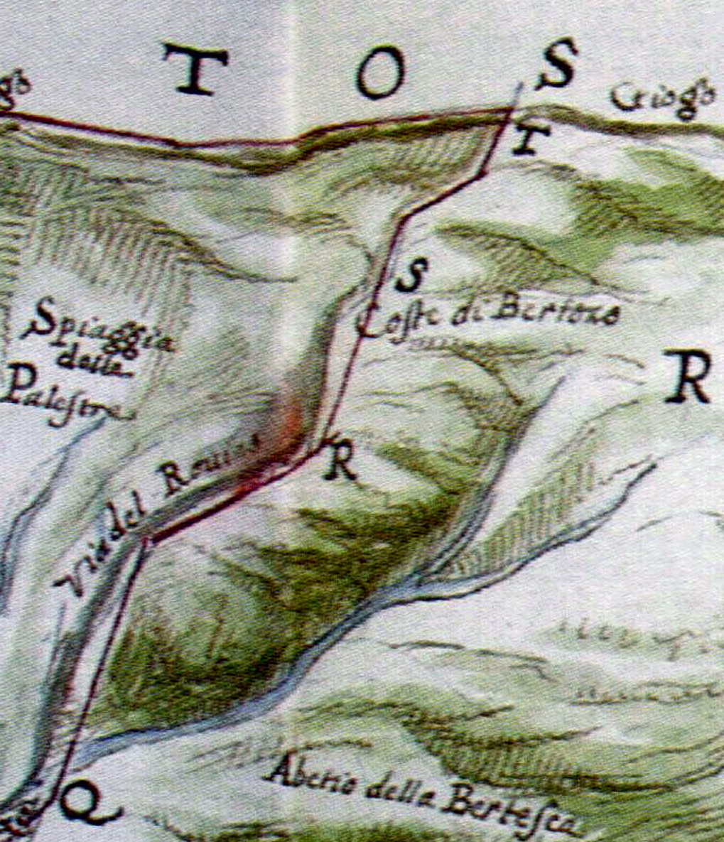 019h/019p – Un altro antico percorso dall’Eremo (v. pista della foto 018a) si dirigeva verso il Passo della Crocina (già Crocina di Bagno o Croce di Guagno) ricongiungendosi con la Via Maestra che vien dall’Eremo attraverso il crinale della Bertesca: tale toponomastica (v. anche foto 019a/019g) si ritrova nei documenti conservati nell’Archivio dell’Opera del Duomo di Firenze e in una mappa del 1637 (v. particolari a-h) allegata ad una relazione del 1710 del provveditore dell’Opera (riproduzioni integrali della mappa si trovano in A. Gabbrielli, E. Settesoldi, 1977, p. 20, cit. e, a colori, in A. Bottacci, 2009, p. 31, cit.).