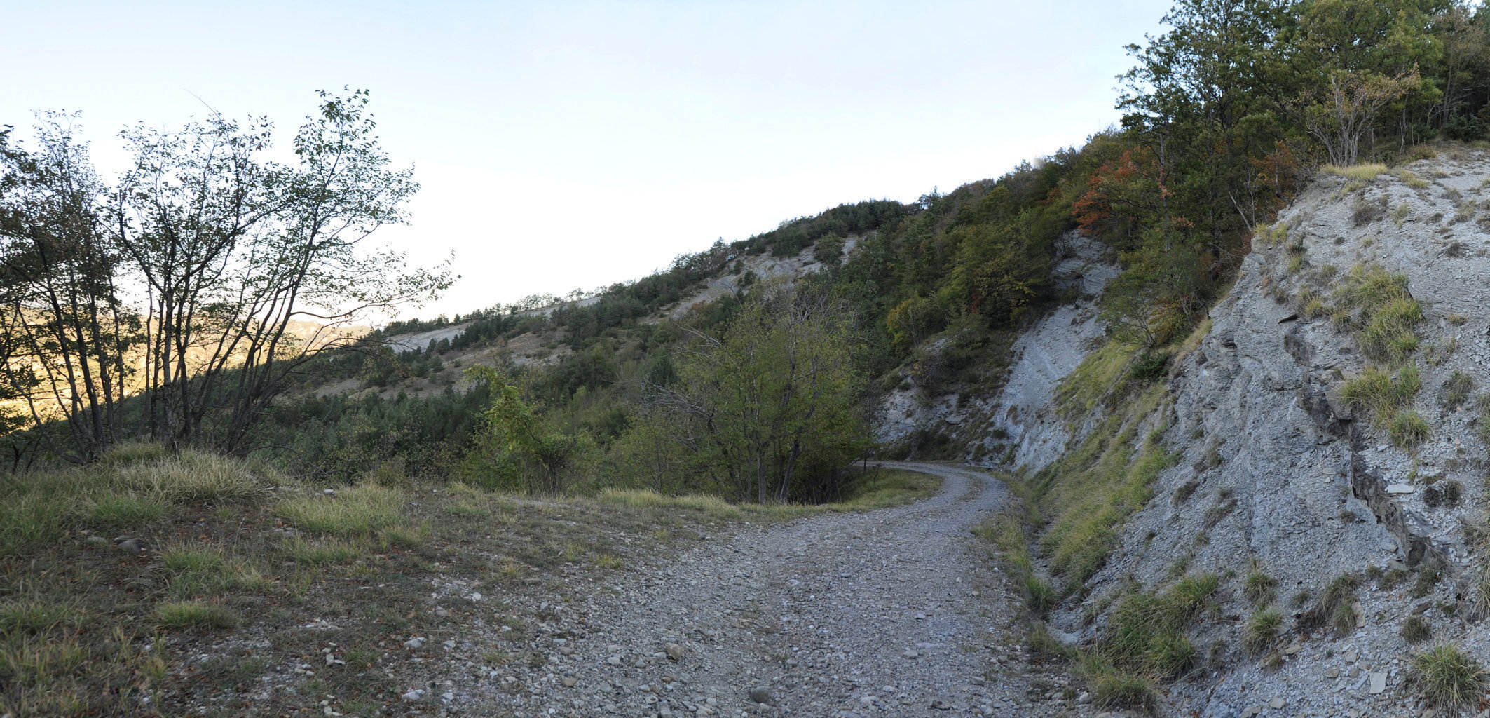 00e1/00e14 - Dalla S.F. Nocicchio-Pietrapazza, tra il Poggiaccio e il viadotto, panoramiche e vedute della valle del Fosso di Rio d’Olmo dalla testata del Fosso di Susinello, mentre il ramo principale si incassa a ridosso del Crinale del Finocchio; il versante insediativo, godente della migliore esposizione ed in passato utilizzato per coltivi e pascolo che hanno incrementato l'instabilità idrogeologica, è oggi totalmente ricoperto da impianti resturativi di pinacee (3/10/11 – 15/11/11 – 16/02/17 – 8/03/17 – 15/03/17).