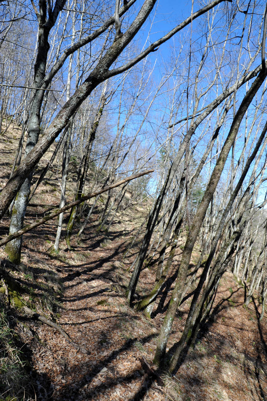 00e15 – 00e16 – Dalla mulattiera che da Ridolmo reca a Susinello, sul crinale che separa i Fossi della Capra e di Susinello, vedute degli opposti versanti, uno ricoperto dalla faggeta, l’altro con vasti rimboschimenti di conifere e fortemente segnato dall’incisione del Fosso della Capra (8/03/17).
