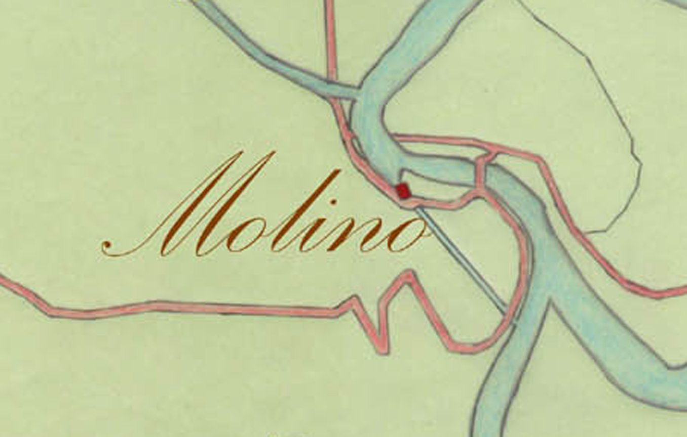 00c4 - 00c5 – Confronto tra schemi di mappa derivati dal catasto ottocentesco e da cartografia moderna che consentono di apprezzare alcune modifiche dell'area, con particolare del mulino dove si nota il berignale, di presa idraulica, e lo stramazzo, di scarico.