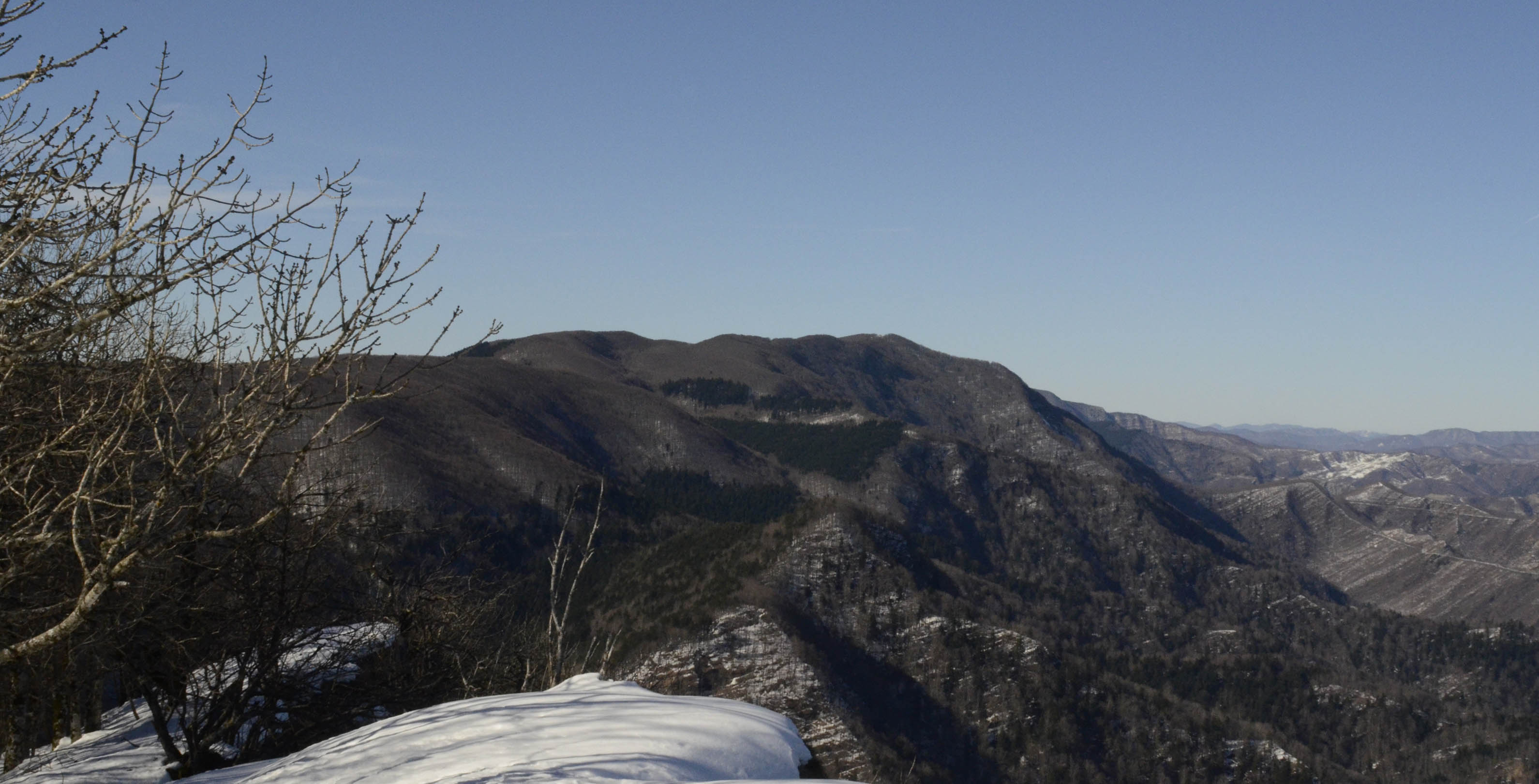 00m1 – 00m2 – Dal Monte Penna, scorci prospettici della Giogana da Giogo Seccheta a Poggio Scali con il vallone del Bagnatoio delimitato dallo sdoppiamento di cresta fino a Poggio Cornacchia e il versante impervio di Sasso Fratino (10/12/10 – 7/2/11).