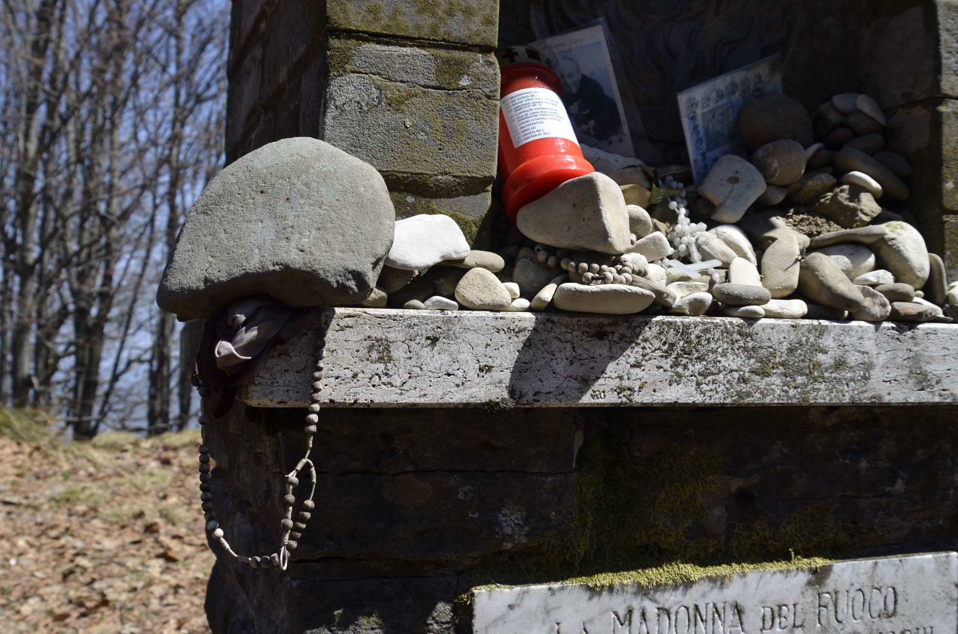 L’improvviso scorcio panoramico precede le pendici occidentali di Poggio Scali dove sorge la Madonna del Fuoco, maestà eretta a protezione dagli incendi, oggetto di particolare venerazione da parte dei pellegrini (recita la lapide: LA MADONNA DEL FUOCO / TORNA OGGI IN QUESTI LUOGHI / DONDE SCESE COL MAESTRO LOMBARDINO / PER BENEDIRE LA MONTAGNA / DEI FORLIVESI CHE IN CITTÀ LA VENERANO / DA CINQUE SECOLI / ED I PASSANTI CHE QUI L’ONORANO / IL CAI DI FORLÌ NEL 50° DI FONDAZIONE /11 SET 1977). La Festa della Madonna del Fuoco, patrona della città, si tiene a Forlì il 4 febbraio. Sulle pendici orientali del poggio, sul filo dei 1500 m di quota, presso un pannello descrittivo delle caratteristiche del sito, si stacca un percorso di antichissima frequentazione, forse anche una tra le vie militari romane, che dal crinale piega a settentrione discendendo lungo la sella di Pian del Pero sul contrafforte secondario e, superato S.Paolo in Alpe (come detto, frequentato almeno già dal 1900-1800 a.C.), si dirige verso Forlì. Vi corrisponde un tratto di sentiero nell’antichità più recente noto come Via del Giogo di Scali, riportato nelle Bozze di mappe catastali come Strada del Poggio Scali e nel Catasto toscano come Via di Scali, specificamente descritto come via che da Poggio Scali scende a Santa Sofia passando per S. Paolo in Alpe nel sopracitato contratto di vendita del 1857 con cui le foreste passarono dall’Opera del Duomo di Firenze alle Reali Possessioni. Tra le vie dei legni è pure confermata all’inizio del XX secolo dal Direttore generale delle Foreste, al Ministero di Agricoltura, A. Sansone, nella relazione sullo stato delle foreste demaniali (cit.) come via del Poggio, che da S. Sofia, per S. Paolo in Alpe e Pian del Pero, sale a Poggio Scali.