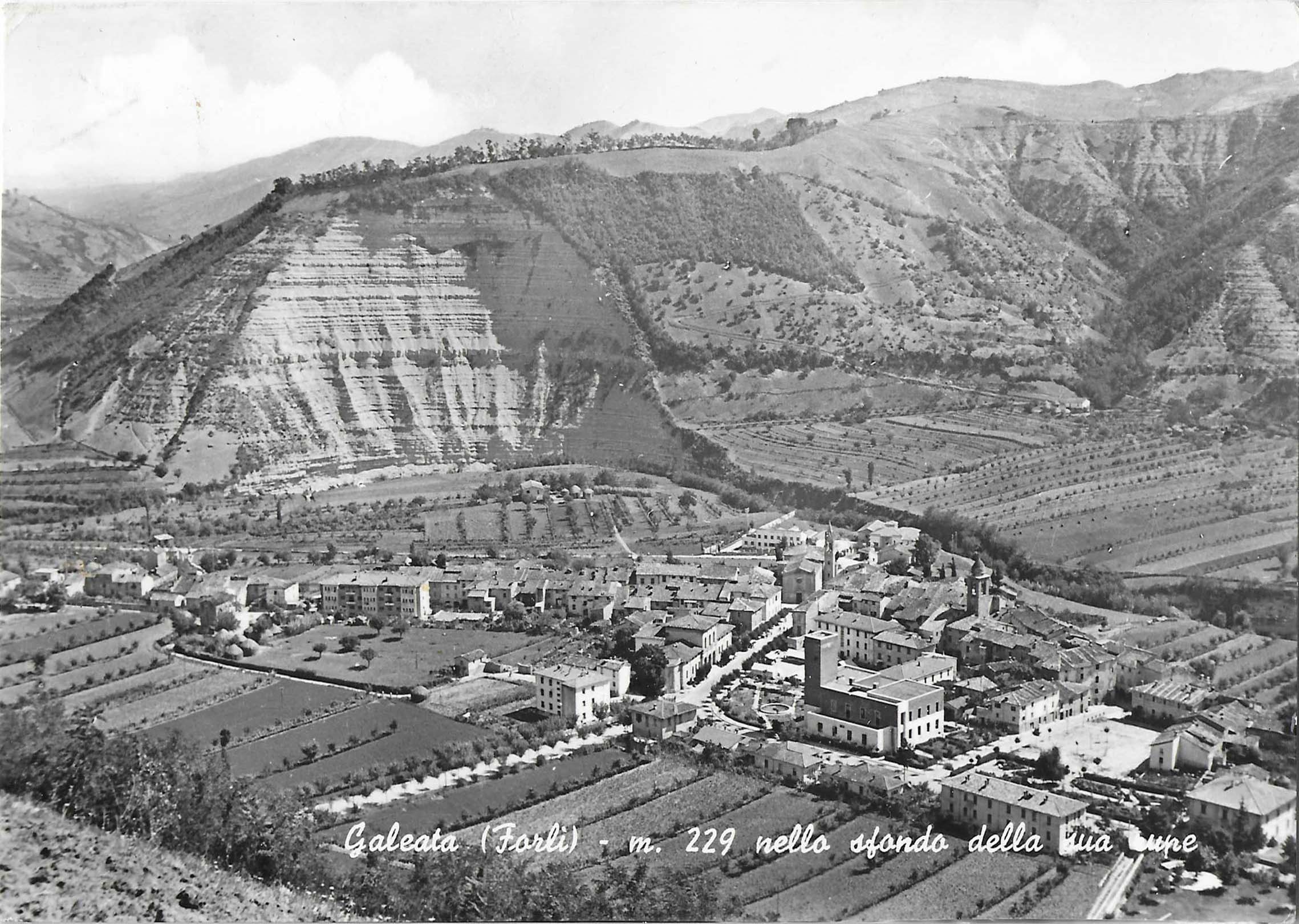 00d11 – 00d12 - Cartolina spedita nel 1964 riproducente Galeata nello sfondo della sua rupe, n. di serie 197 edita dalla Cartolux, fondata da Torquato Nanni Jr., che già negli Anni Trenta e Quaranta andava in giro per la Romagna a fotografare, come ricordano le figlie, e cartolina riproducente anche l’area di Pianetto, dove sorgeva Mevaniola. In età romana l’alta Val Bidente ricadeva sotto il controllo del Municipio di Mevaniola, centro cittadino dotato di teatro e terme, cosiddetto per i rapporti con gli umbri di Mevania, l’odierna Bevagna. L’economia locale, prevalentemente pastorale, e le consuetudini religiose caratterizzavano la piccola Mevania già dalla protostoria in rapporto al Casentino con i pellegrinaggi ai santuari delle acque medicamentose sul Falterona. Tra IV e V secolo d.C. questo centro istituzionale viene a mancare, decaduto e abbandonato per la stasi dei mercati e l’insicurezza dei traffici successivamente alla guerra greco-gotica (535-553 d.C.) e alla calata dei Longobardi (568 d.C.). Segue cartolina databile agli Anni Novanta dove è parzialmente visibile l'area archeologica di Mevaniola tra Galeata e Pianetto.