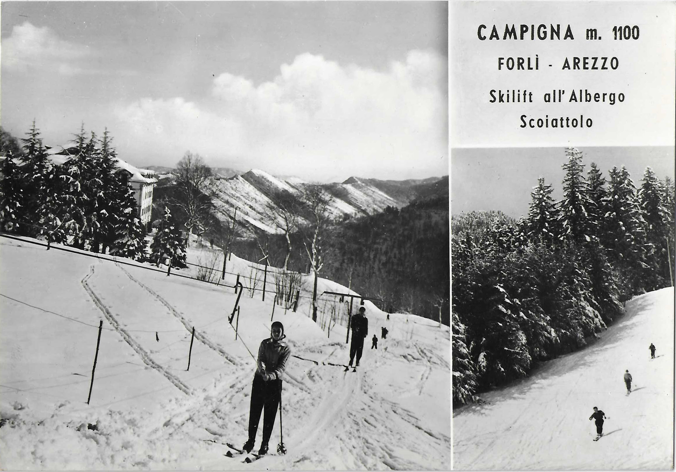 00g13c – Cartolina Cartolux n. serie 408, Campigna Skilift all’Albergo Scoiattolo, databile ai primi Anni Sessanta (si scorge l’Hotel Granduca ristrutturato) che documenta come a Campigna esistesse una pista da sci attrezzata con skilift sulla sterrata che scende a Villaneta (collezione personale).