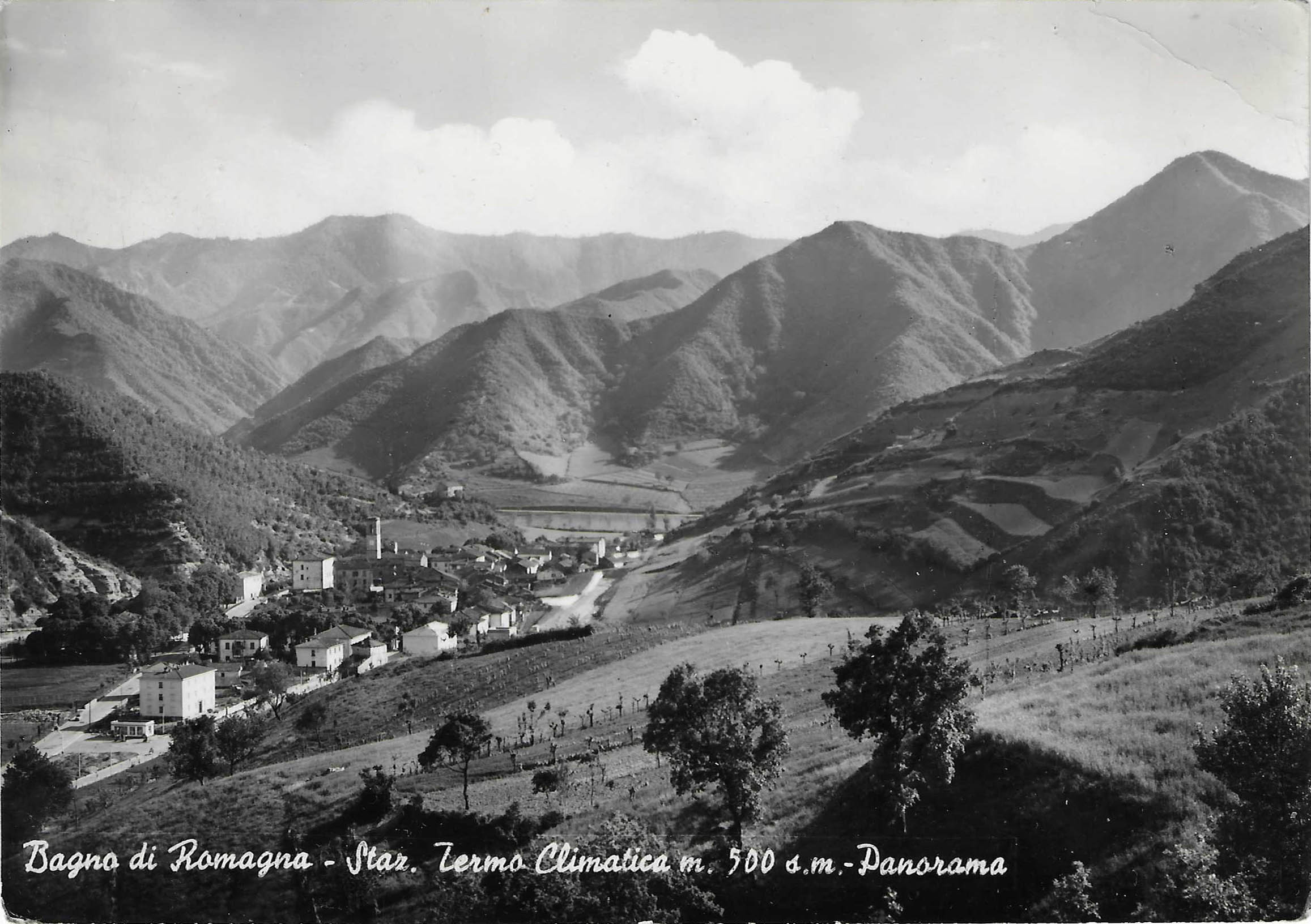 00p11 – 00p12 – 00p13 – Cartoline con foto riprese da Bagno di Romagna verso lo Spartiacque e il Contrafforte Principale; nella prima Ed. Jacopo Moretti spedita nel 1955 si nota tra l’altro il Monte Zuccherodante, le altre due (rispettivamente Ed. Leone Zaccarelli e Fototipia Berretta) hanno identico punto di ripresa ma risalgono per spedizione al 1957, con didascalia sul retro “Terme di Bagno di Romagna” e al 1972 (collezione personale).