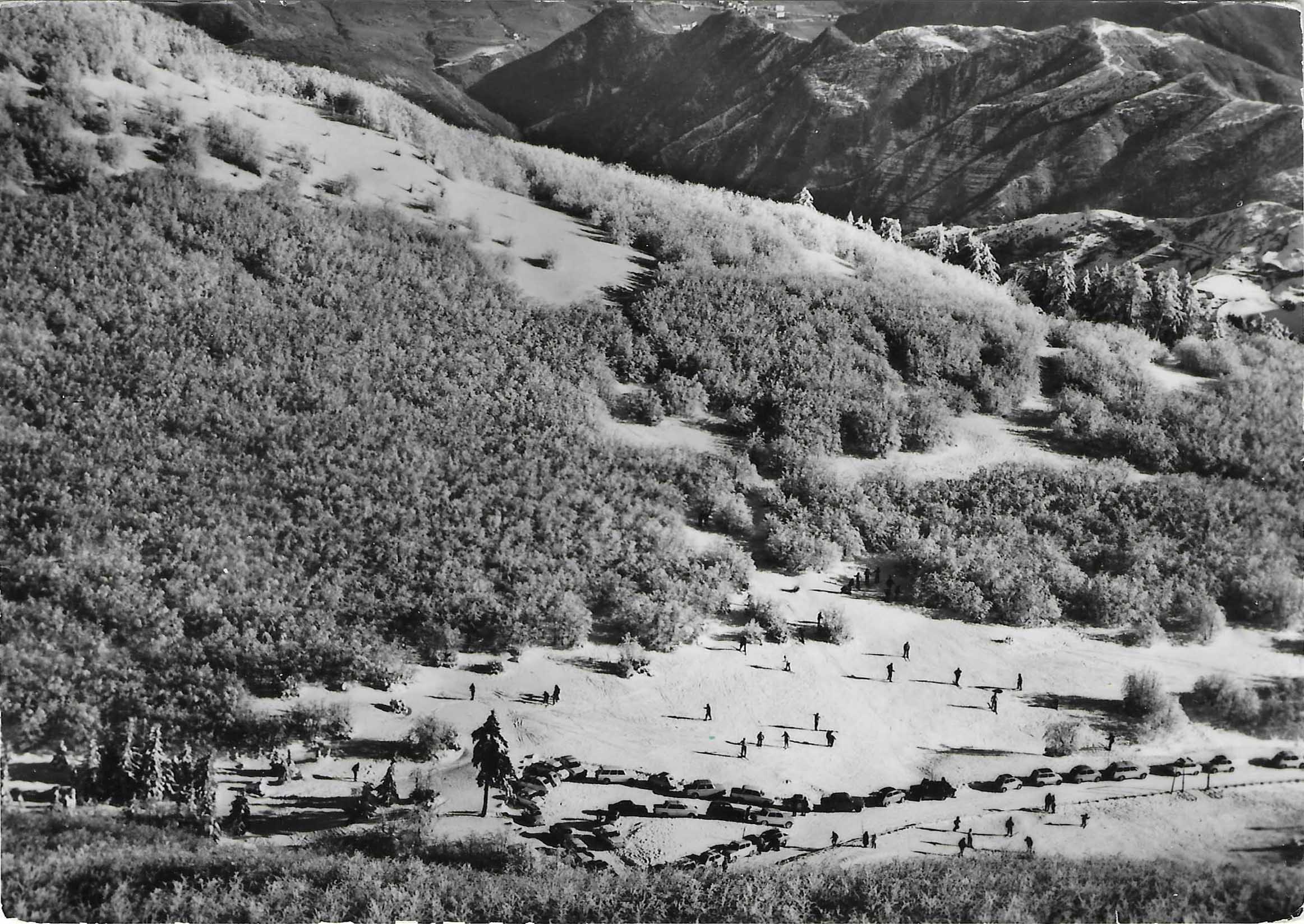 00q9a – Cartolina della Cartolux, n. serie 262/3, Camaldoli Campigna – Campi di sci della Burraia, con veduta della Burraia innevata ripresa dal Gabrendo e l’area sciistica in piena attività, infatti in primo piano si nota lo skilift a palo lungo con molla interna e numerosi sciatori sulla pista dei prati. Nella cartolina, risalente alla fine degli Anni Cinquanta in quanto già esistente lo skilift, si notano inoltre i fabbricati della Burraia e tre ex-casermette militari poste sul margine dei prati, distanziate tra essi, che vennero utilizzate dai militari di servizio presso la stazione radio ubicata presso la Burraia forse fino al 1947; all’epoca della foto una delle tre casermette veniva utilizzata dallo Sci Club (collezione personale).