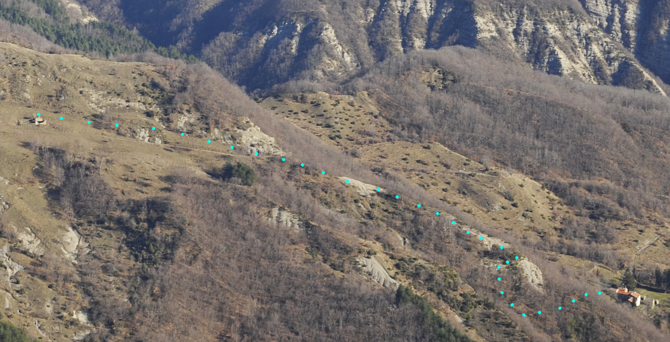 00b1/00b6 – Dalla S.F. di Giogo di Castagno (vi si giunge tramite la S.P. n.94 del Castagno dal Passo della Calla) tagliata sotto Poggio Piancancelli, scorci panoramici consentono la vista della Valle delle Celle dove, tra l’alternanza di prati pascoli, aree brecciate, brulle e incolte e l’inteso foliage autunnale, si notano Torni e Fossa in diverse stagioni e si riconosce la cresta dove correva l’antica strada che transitata da La Fossa nel risalire dal fondovalle si dirigeva verso il crinale passando presso Fossa e Torni, qui ormai trasformata in pista poderale (16/04/16 – 7/10/17 - 1/01/19)