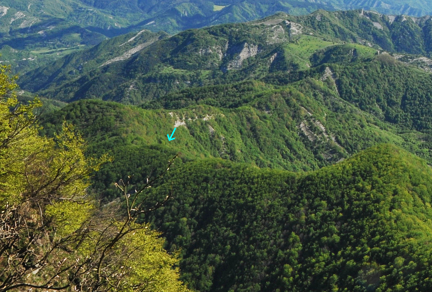 001o – 001p – 001q – Il Canale del Pentolino incide lo spartiacque appenninico fino al crinale aprendo un varco panoramico che consente la vista dall’alto del primo tratto di contrafforte a partire dalla sella di Pian del Pero, e solo l’osservazione attenta consente di distinguere il modesto emergere di Poggio alla Fringuella (15/05/14).
